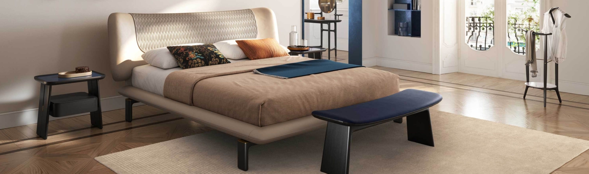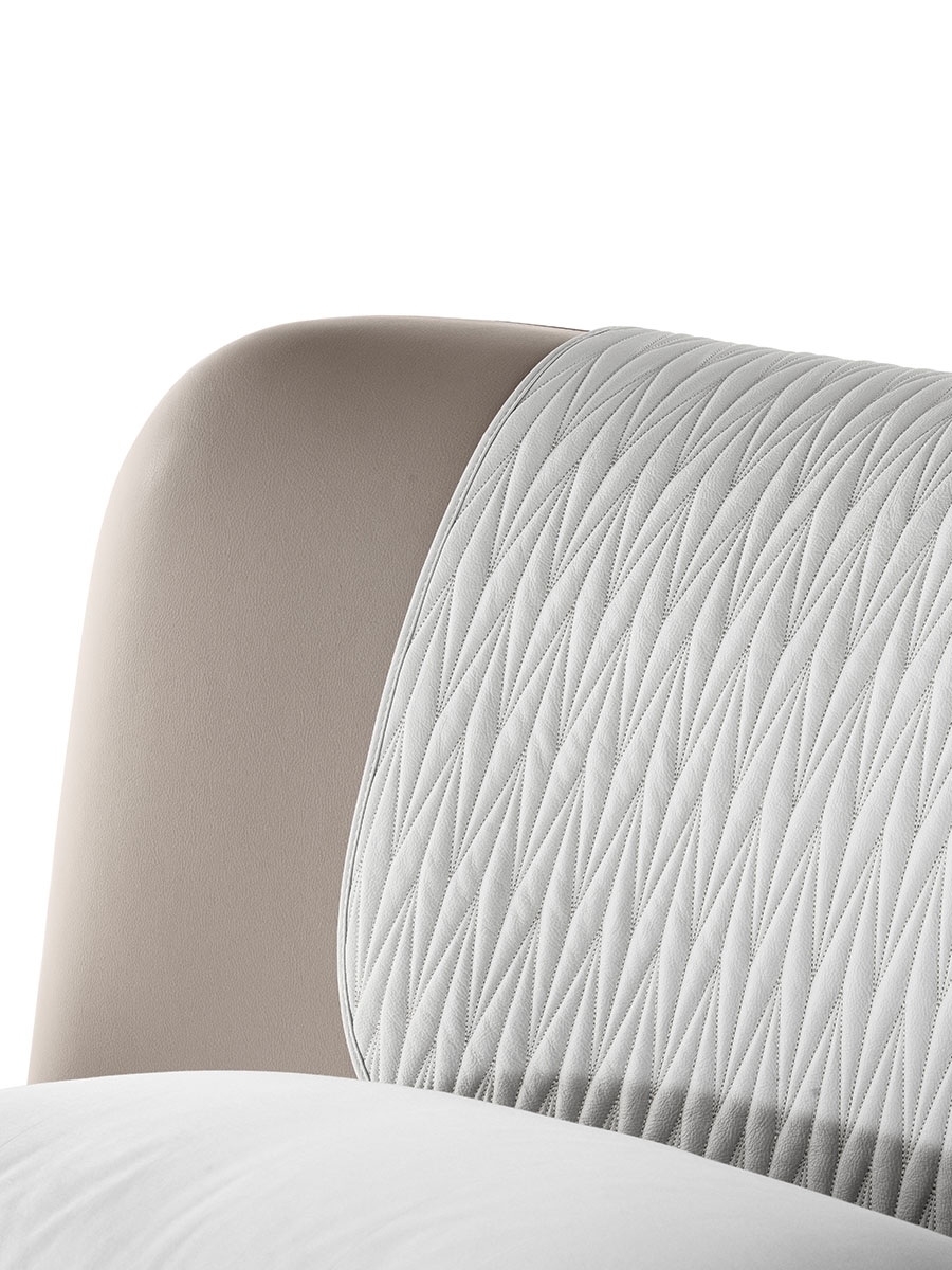 The DUO designer bed reinterprets the hallmark elements of the DUO collection, such as the curved lines, seen here in the headboard. The structure is made of steel, with a base composed of struts in lime or tulip wood. A light layer of padding wraps around the entire profile of the base. The suspended padded headboard extends beyond the frame, creating a wraparound effect, and features removable decorative quilting with matalassé stitching. The cylindrical legs are made of aluminum, upholstered in Pelle Frau® leather to match the bed. The DUO leather bed is available in different sizes and upholstery options. The Poltrona Frau logo is hot-stamped on the back of the headboard.