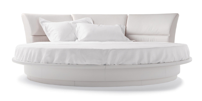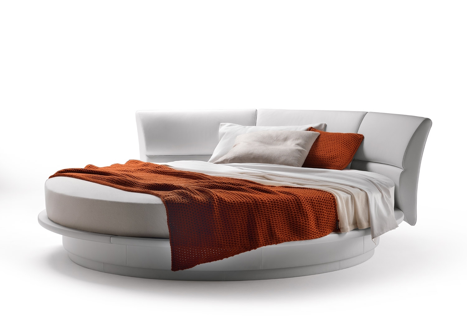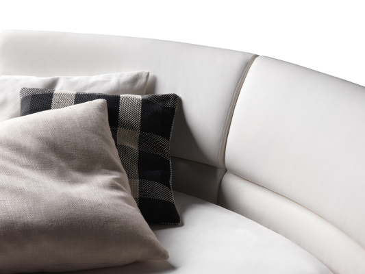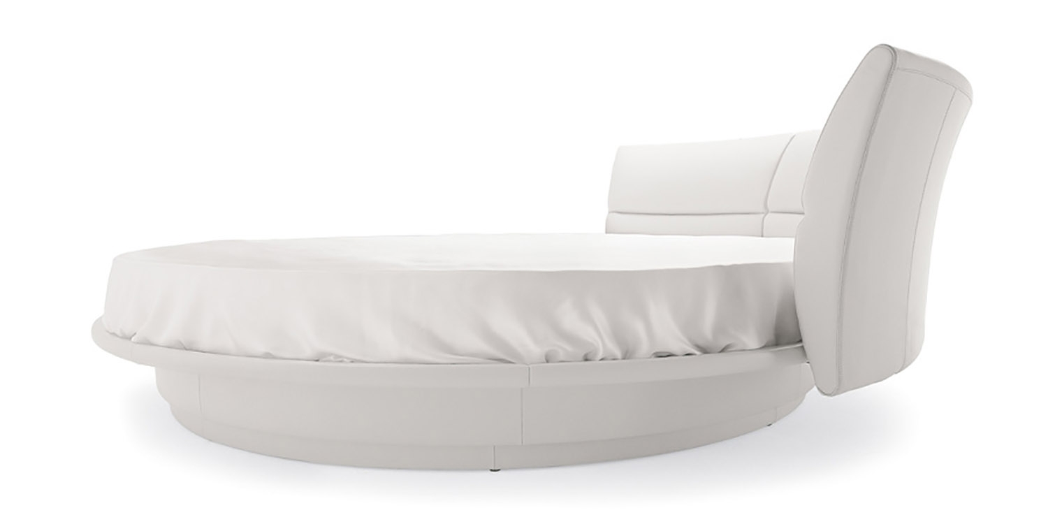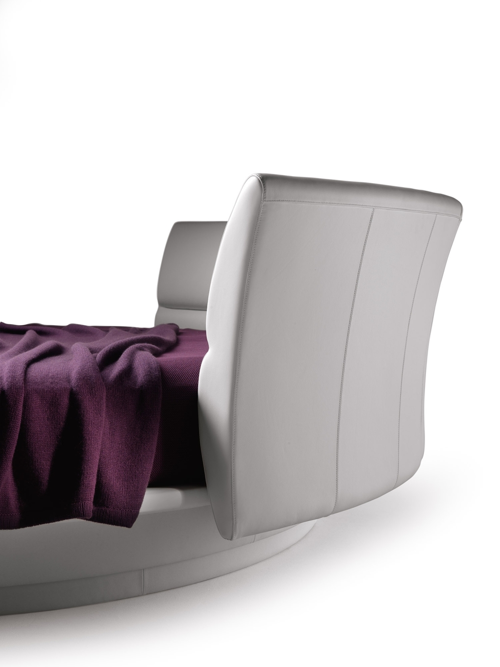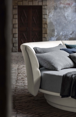 The bedhead of the Lullaby Due has a wing silhouette and is cadenced with visible stitching. Its structure is made from steel with moulded polyurethane foam padding. The bedhead is mounted on the swivel base which can turn 360°, both clockwise and anticlockwise, thanks to a swivel mechanism inside the base. The Lullaby Due’s base is made from poplar plywood and padded with polyurethane foam. The mattress supplied, diameter 220 cm x 20 cm height (see “Beds and mattresses diagram”), is composed of steel pocket springs with wool padding for the winter side and cotton padding for the summer side. The bedstead base is made from plywood with padding in polyurethane foam and upholstery in Poltrona Frau canvas. The Lullaby Due bed is upholstered in Pelle Frau® leather.