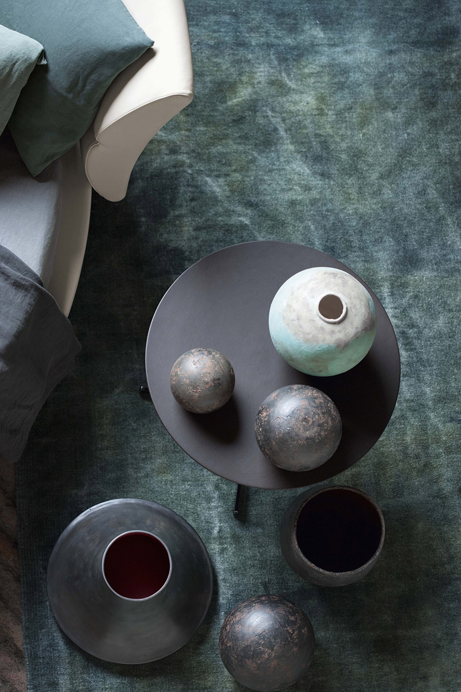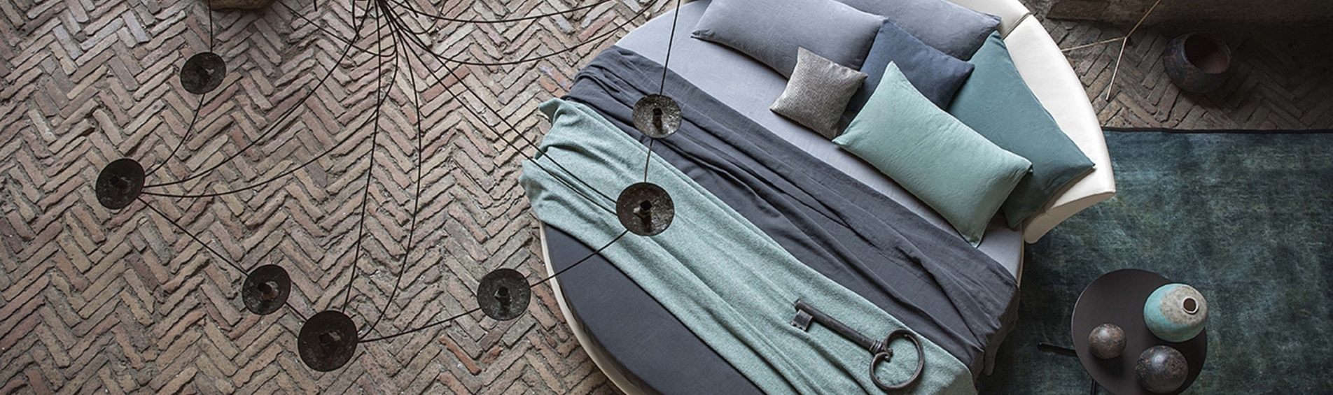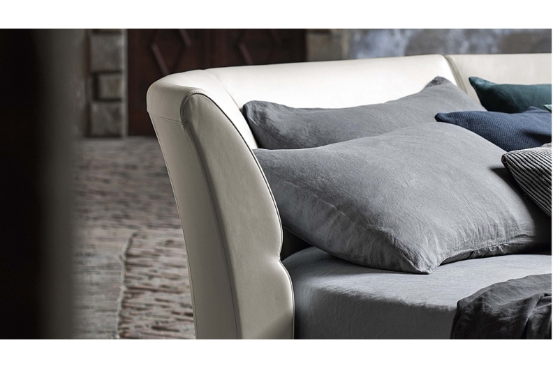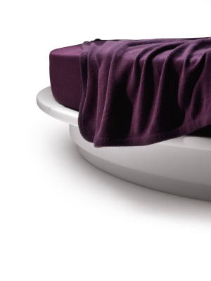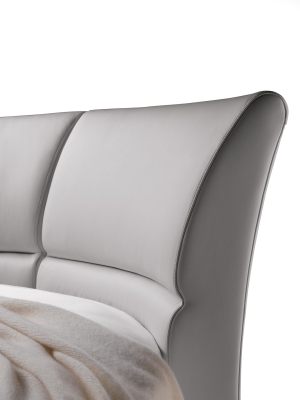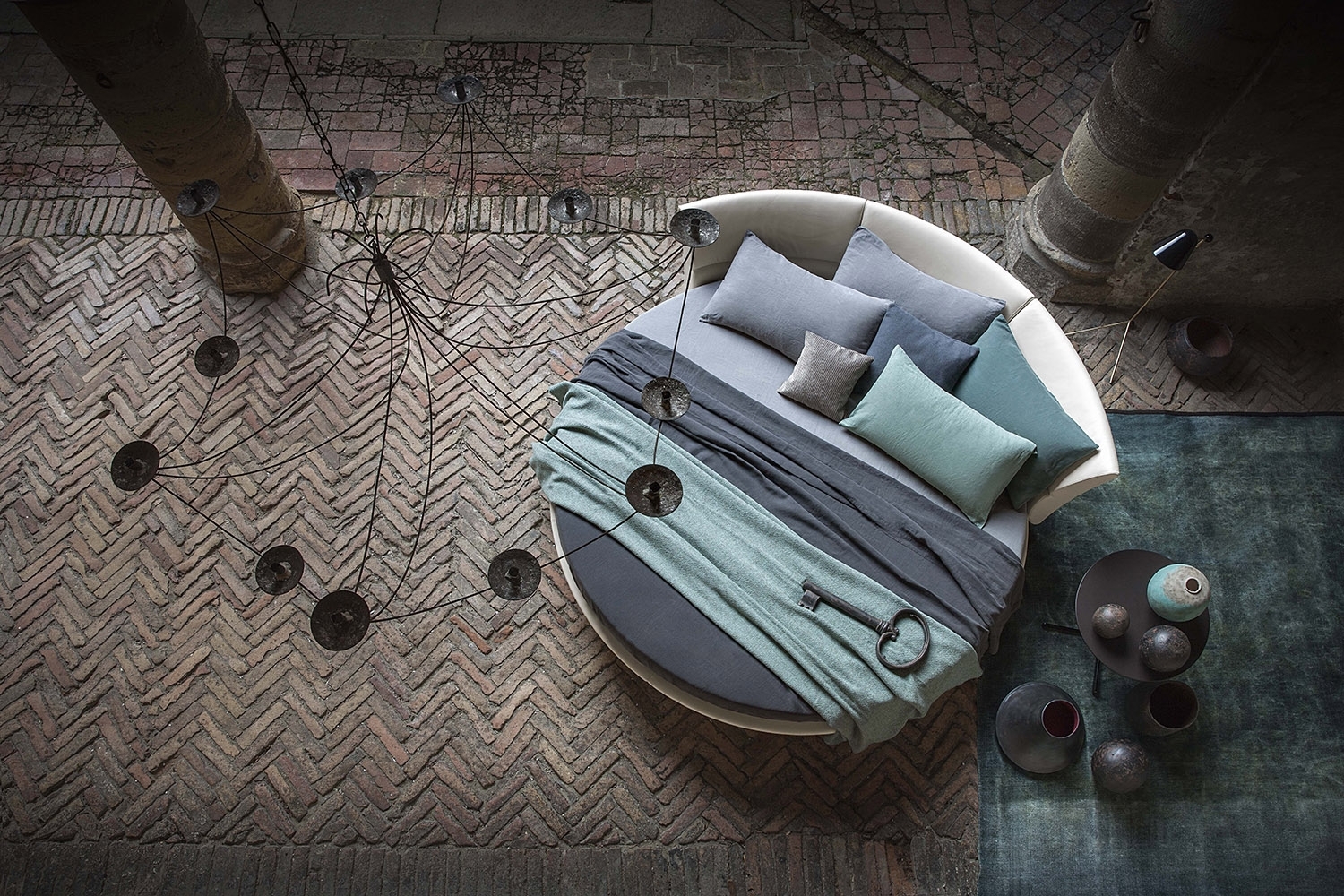 The bedhead of the Lullaby Due has a wing silhouette and is cadenced with visible stitching. Its structure is made from steel with moulded polyurethane foam padding. The bedhead is mounted on the swivel base which can turn 360°, both clockwise and anticlockwise, thanks to a swivel mechanism inside the base. The Lullaby Due’s base is made from poplar plywood and padded with polyurethane foam. The mattress supplied, diameter 220 cm x 20 cm height (see “Beds and mattresses diagram”), is composed of steel pocket springs with wool padding for the winter side and cotton padding for the summer side. The bedstead base is made from plywood with padding in polyurethane foam and upholstery in Poltrona Frau canvas. The Lullaby Due bed is upholstered in Pelle Frau® leather.