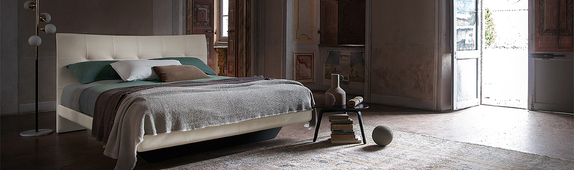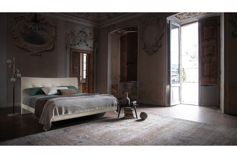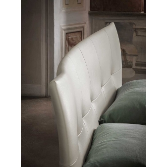 The headboard is in lightly padded solid beech and upholstered with Pelle Frau® leather. The base is lightly padded in polyurethane foam with spruce blockboard for the sides and poplar plywood for the footboard. The front corners are enriched with a leather trim. The back feet of the Aurora Due bed are formed from the headboard, which extends down to the floor, while the front base is in wood with black scratchproof paint and consists of a single trapezoid the same width as the bed.