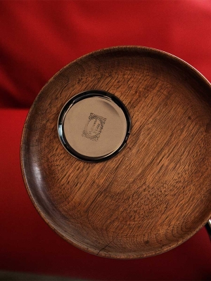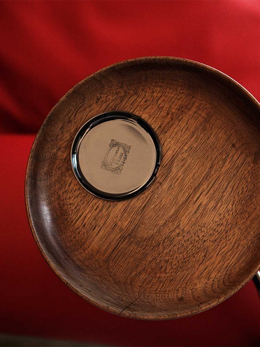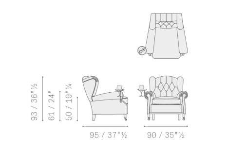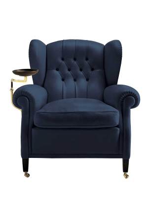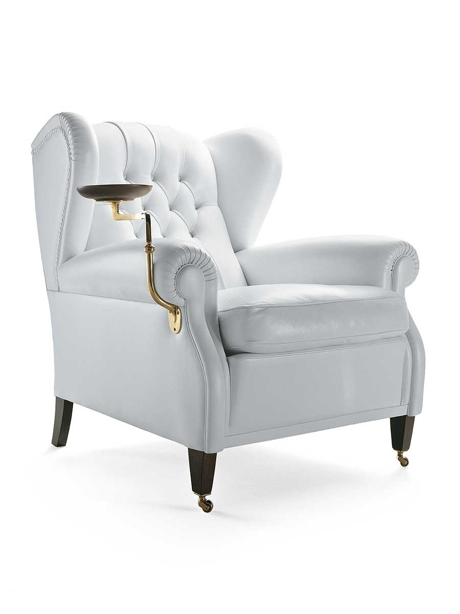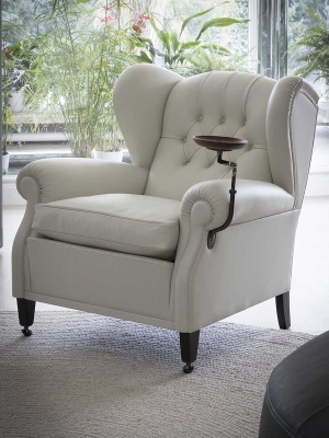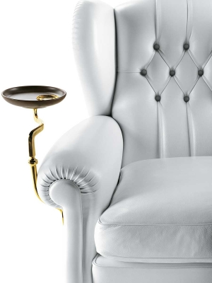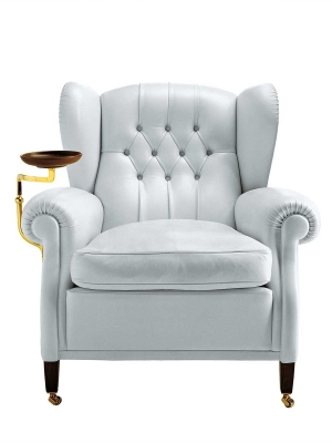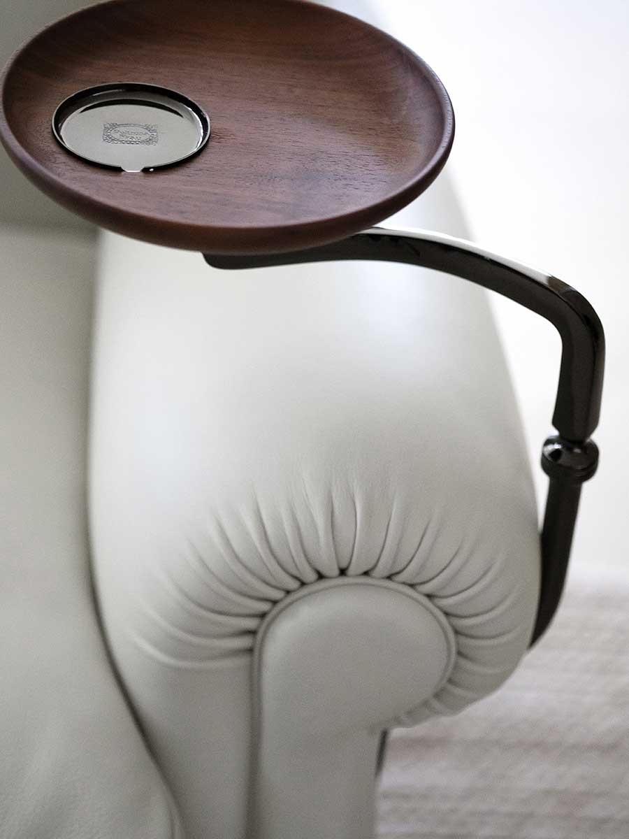Each “1919” armchair is numbered. The supporting structure is made from solid seasoned beech. The seat, backrest and armrest spring system consists of hand-tied steel biconical springs attached to jute belts. The seat is padded with rubberised horsehair while the backrest and armrests are in hand-shaped vegetable horsehair. The seat cushion is in goose down. The backrest design is obtained with manual capitonné processing. The castors and metal parts (plate holder arm, ashtray and number plate) can have a gold or gunmetal grey finish. The “1919” armchair is available in two versions: without plate and with ashtray plate or cup holder (both of which can be mounted on the left or right).
