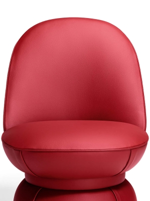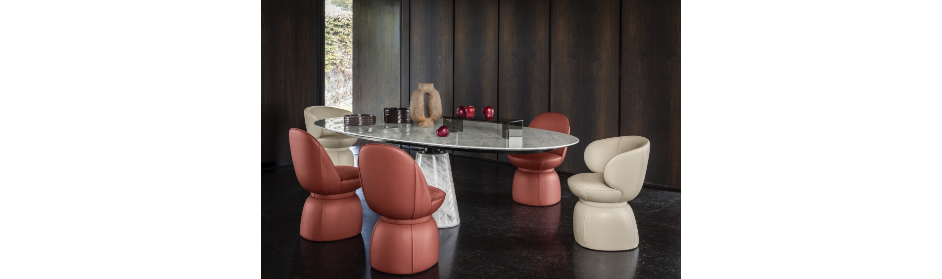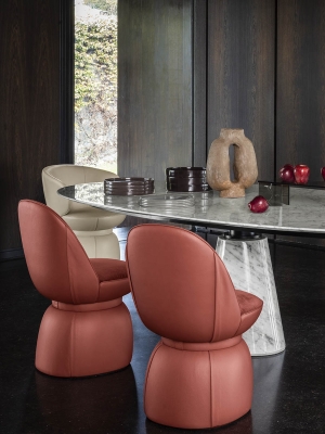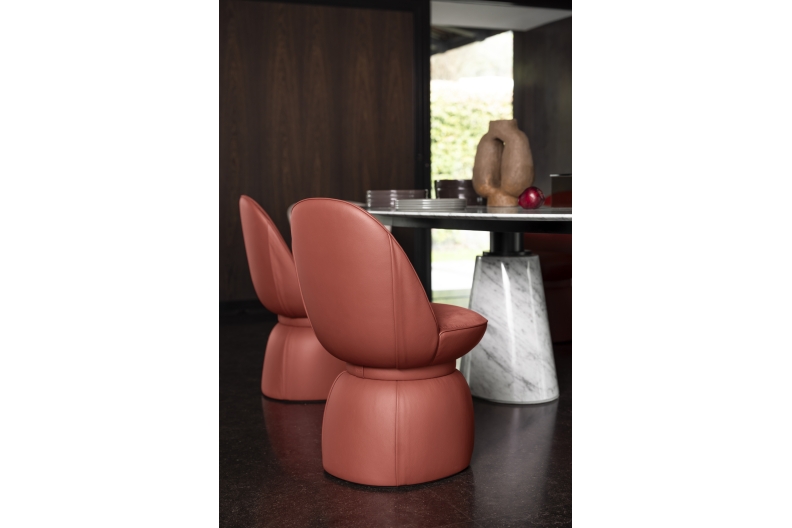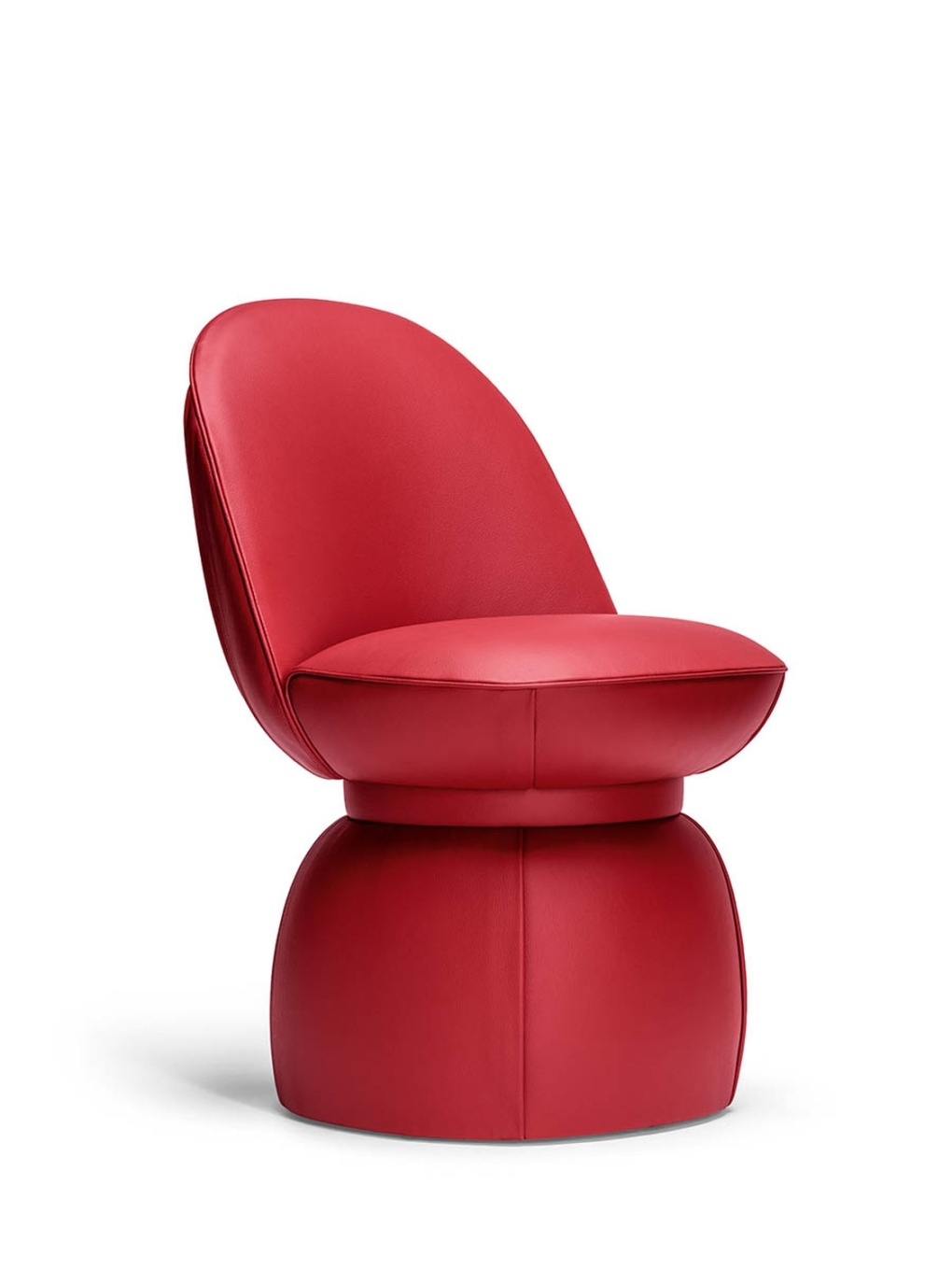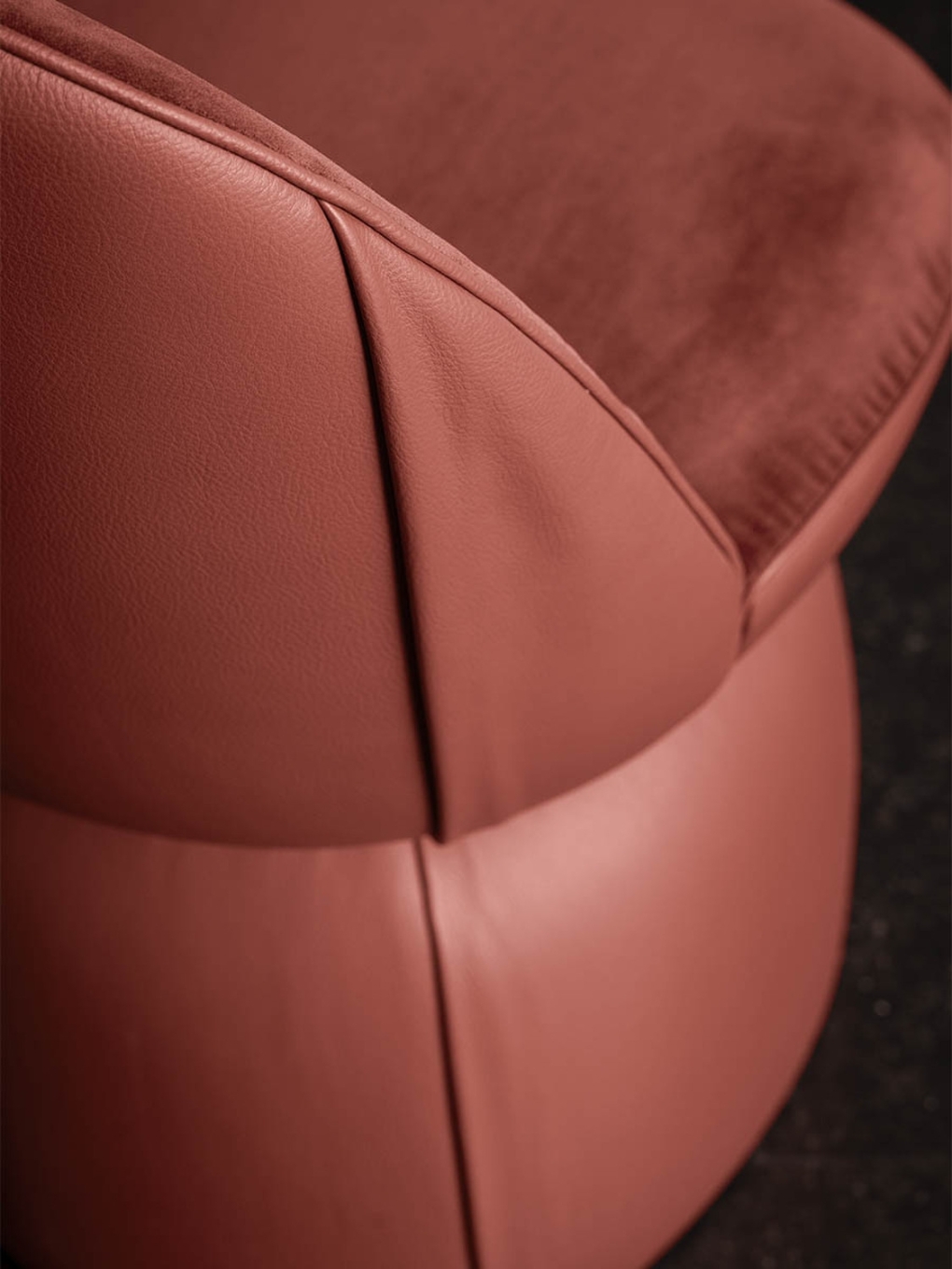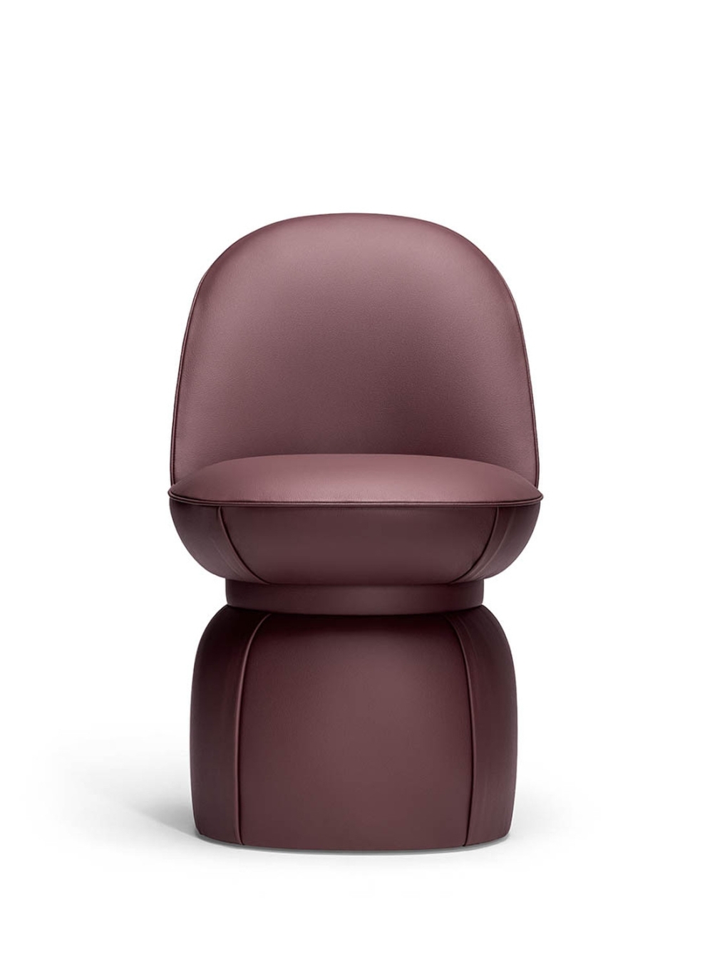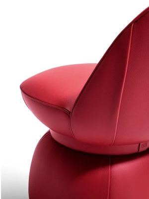 Leplì is a chair, armchair, stool, bench, and pouf. Kensaku Oshiro designs four versatile pieces with a strong identity. The designer draws on traditional Poltrona Frau processes and decorations, combining them with sartorial details borrowed from the world of fashion. Classic stitching and soft folds bring out the sinuous simplicity of the design. The voluptuous curves of the stool, in particular, are inspired by the female form and, like in a dress, a slender belt highlights her “waist”.