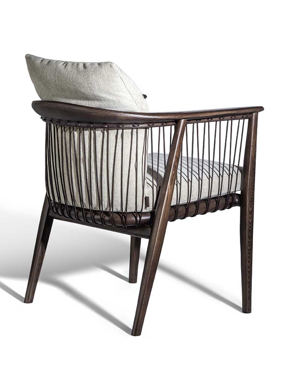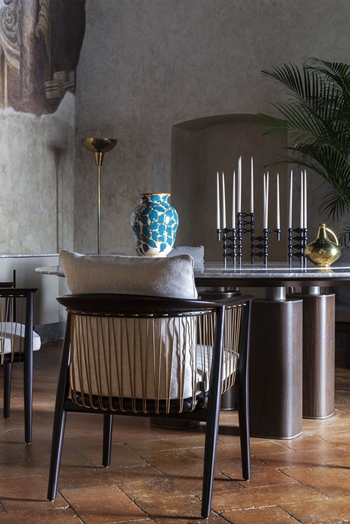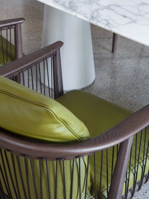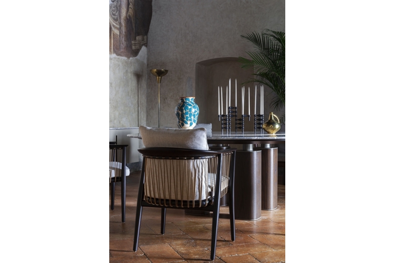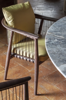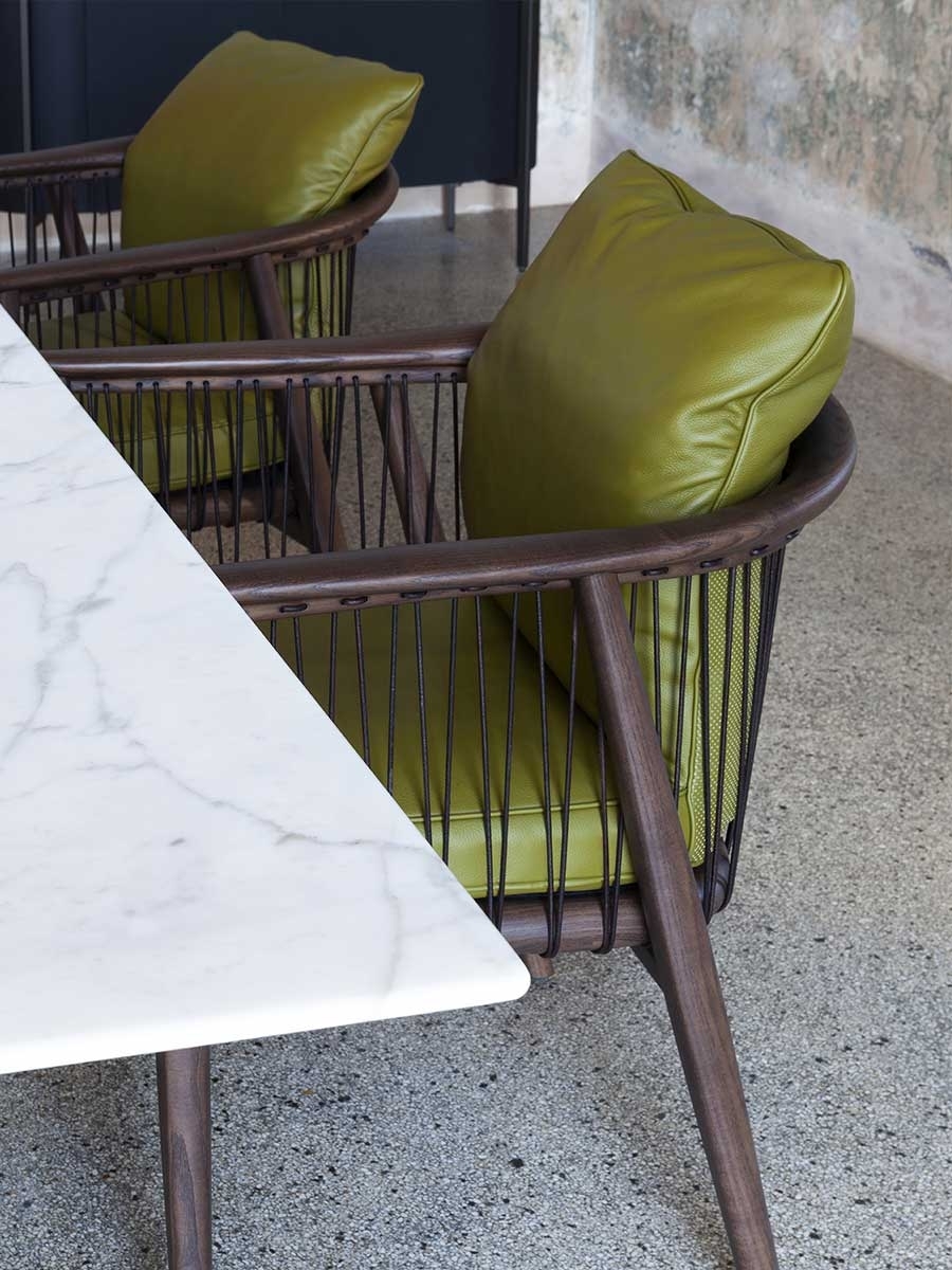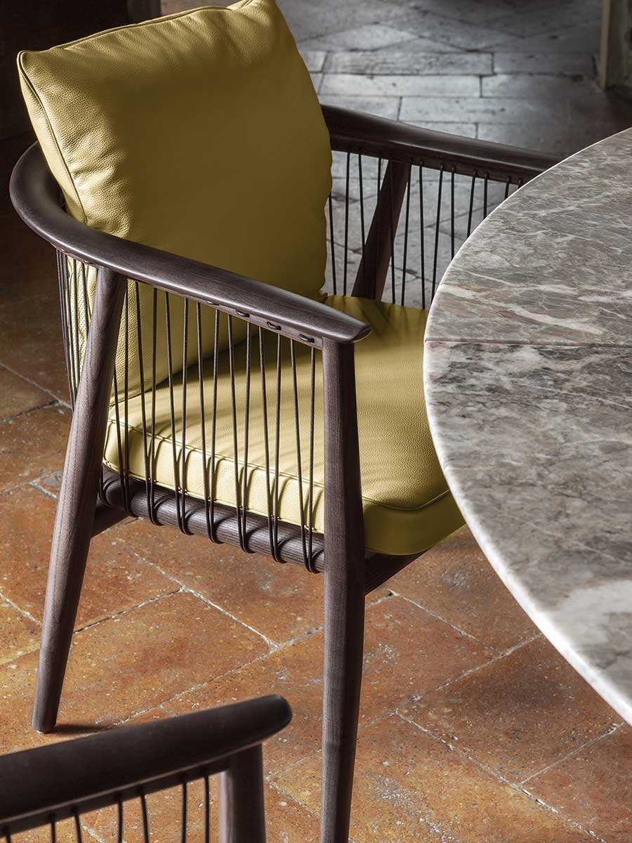 Inspired by the ultra-comfortable chair created for the 3-Michelin star Four Season restaurant in Hong Kong, the Viola chair, designed by AB Concept for Poltrona Frau, has elegant lines that sacrifice nothing in terms of comfort. AB Concept has revisited a classic design, giving it a decidedly contemporary touch. The result is a product with great formal lightness and a solid and void effect which enhances the dining table chair both when it is used alone and when it is combined with a table. Thanks to its soft and comfortable curves, the wooden backrest also creates the armrest and is embellished with a weave consisting of sixty saddle-leather laces which connect it to the frame.