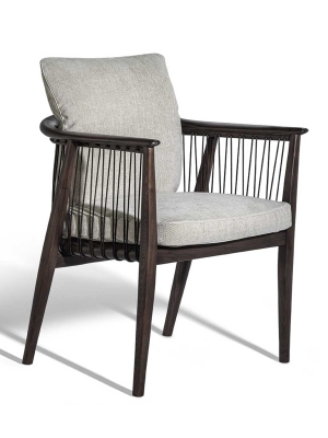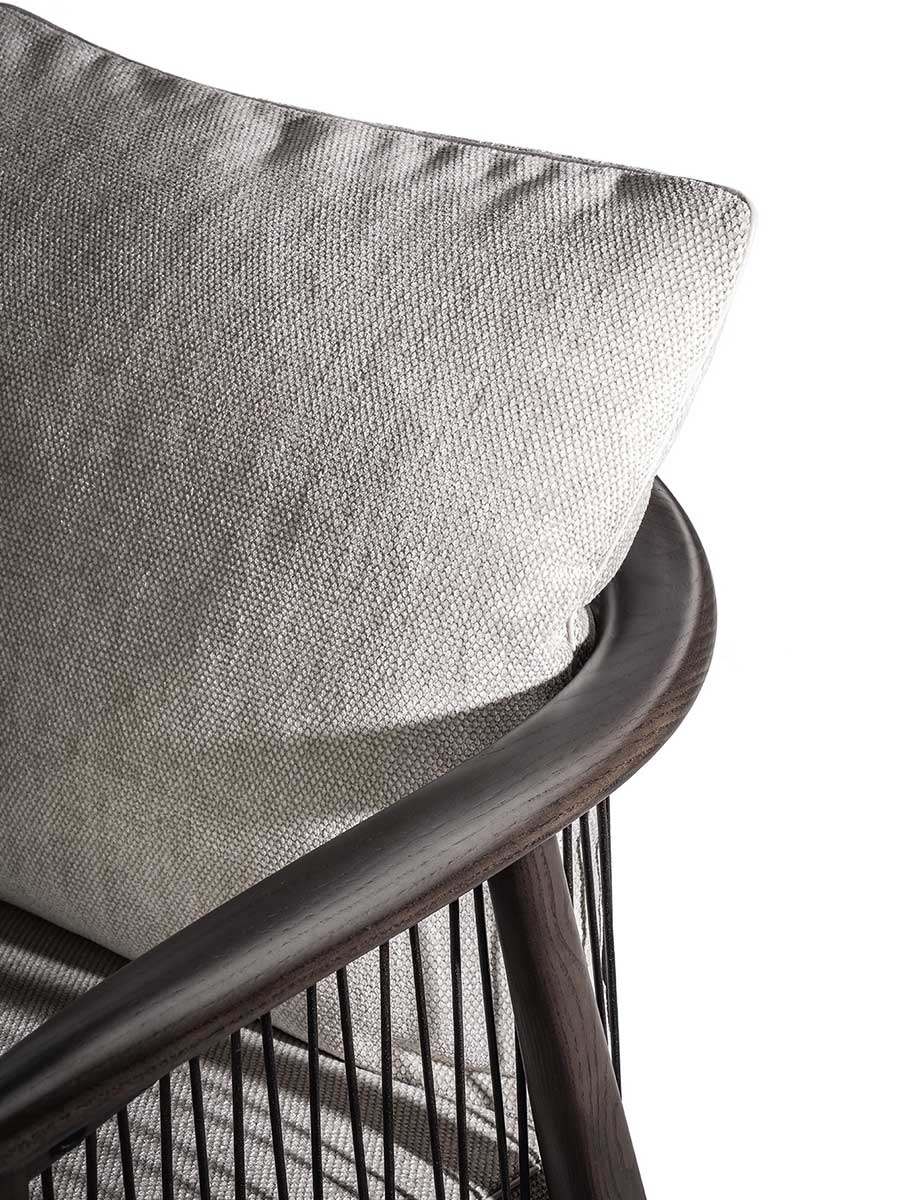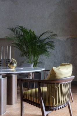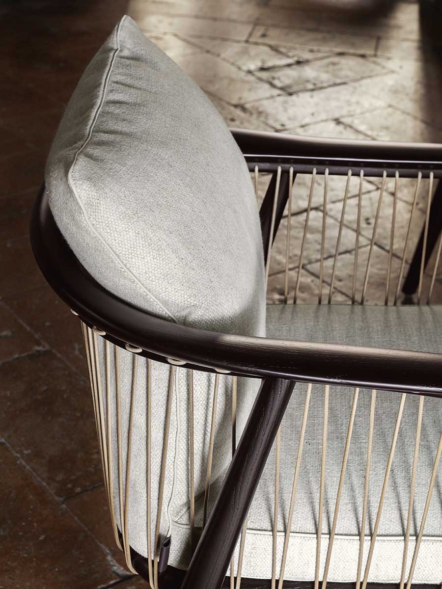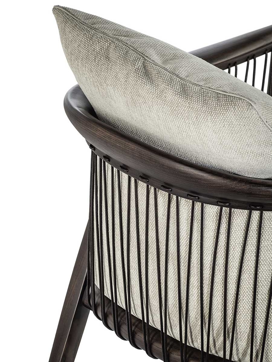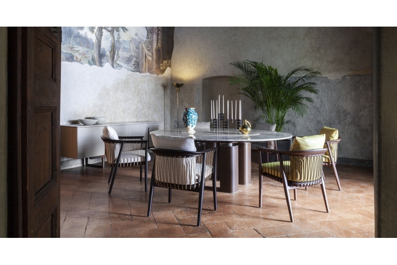 Inspired by the ultra-comfortable chair created for the 3-Michelin star Four Season restaurant in Hong Kong, the Viola chair, designed by AB Concept for Poltrona Frau, has elegant lines that sacrifice nothing in terms of comfort. AB Concept has revisited a classic design, giving it a decidedly contemporary touch. The result is a product with great formal lightness and a solid and void effect which enhances the dining table chair both when it is used alone and when it is combined with a table. Thanks to its soft and comfortable curves, the wooden backrest also creates the armrest and is embellished with a weave consisting of sixty saddle-leather laces which connect it to the frame.