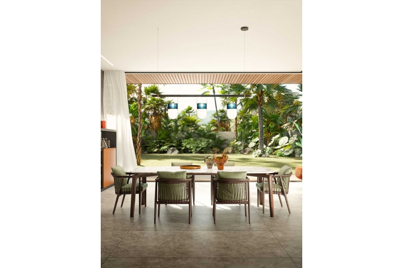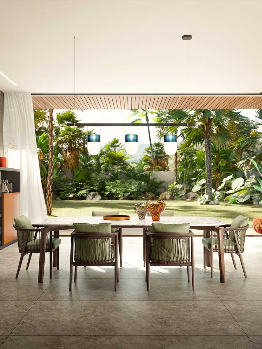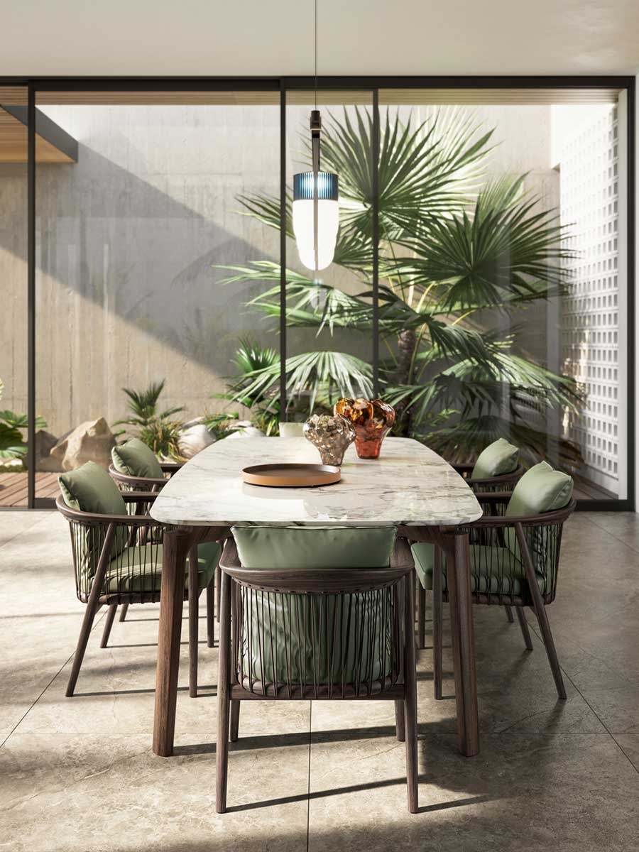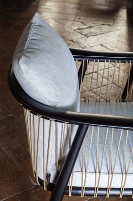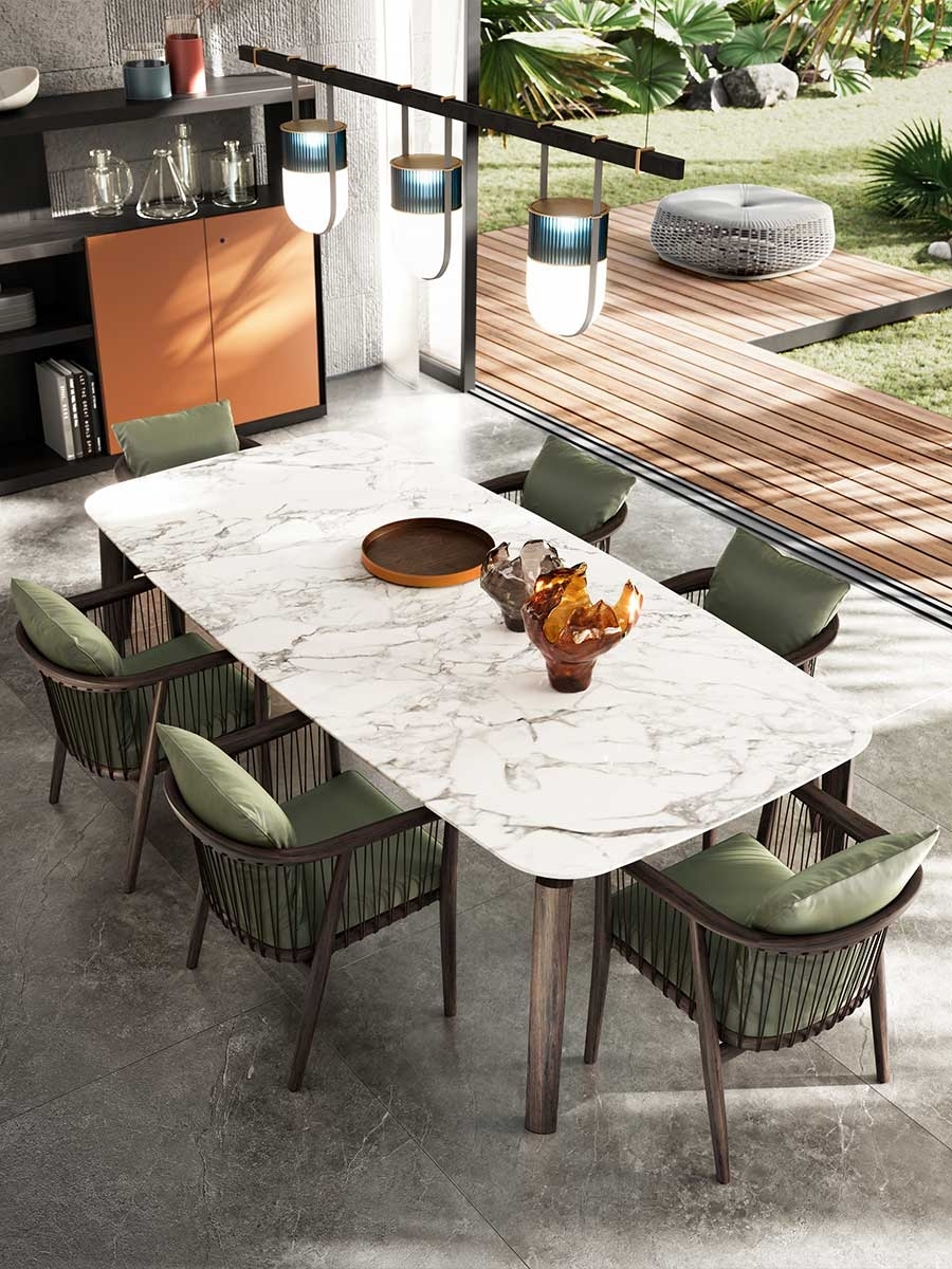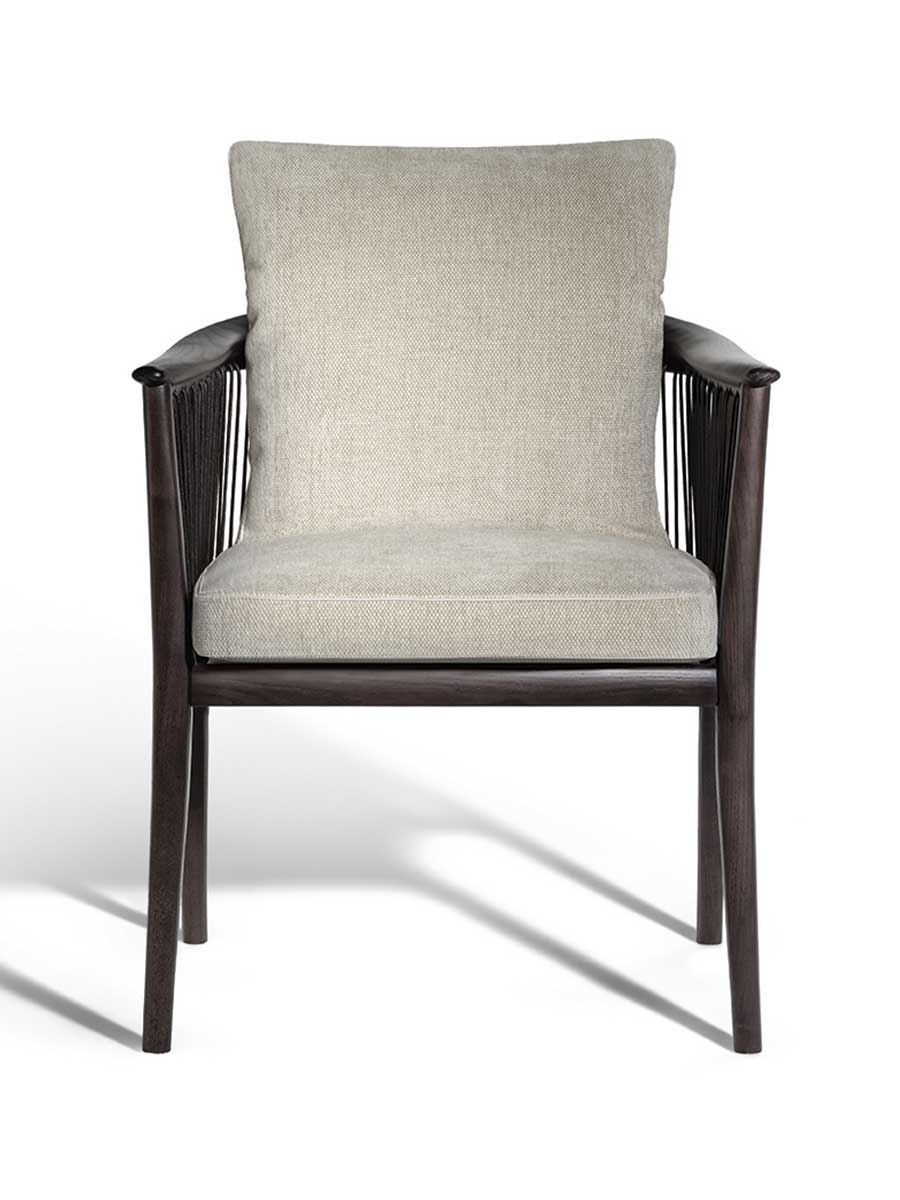 Inspired by the ultra-comfortable chair created for the 3-Michelin star Four Season restaurant in Hong Kong, the Viola chair, designed by AB Concept for Poltrona Frau, has elegant lines that sacrifice nothing in terms of comfort. AB Concept has revisited a classic design, giving it a decidedly contemporary touch. The result is a product with great formal lightness and a solid and void effect which enhances the dining table chair both when it is used alone and when it is combined with a table. Thanks to its soft and comfortable curves, the wooden backrest also creates the armrest and is embellished with a weave consisting of sixty saddle-leather laces which connect it to the frame.