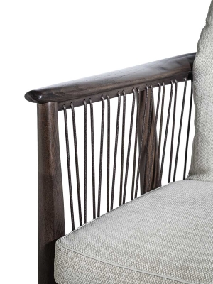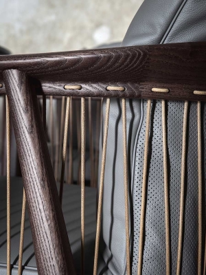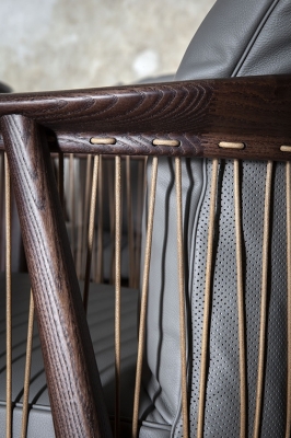 The frame of the Viola chair is made from solid ash in a Moka or Wenge stain embellished with a weave made from dark brown or natural saddle-leather laces. The seat spring system consists of elastic belts. There are soft cushions on the seat and backrest. The seat cushion is filled with polyurethane foam and polyester wadding while the backrest is padded with down and has an insert in polyurethane foam. The two cushions form a single whole which is fixed to the frame using two snap buttons. The removable upholstery of the Viola chair is in Pelle Frau® leather or fabric.