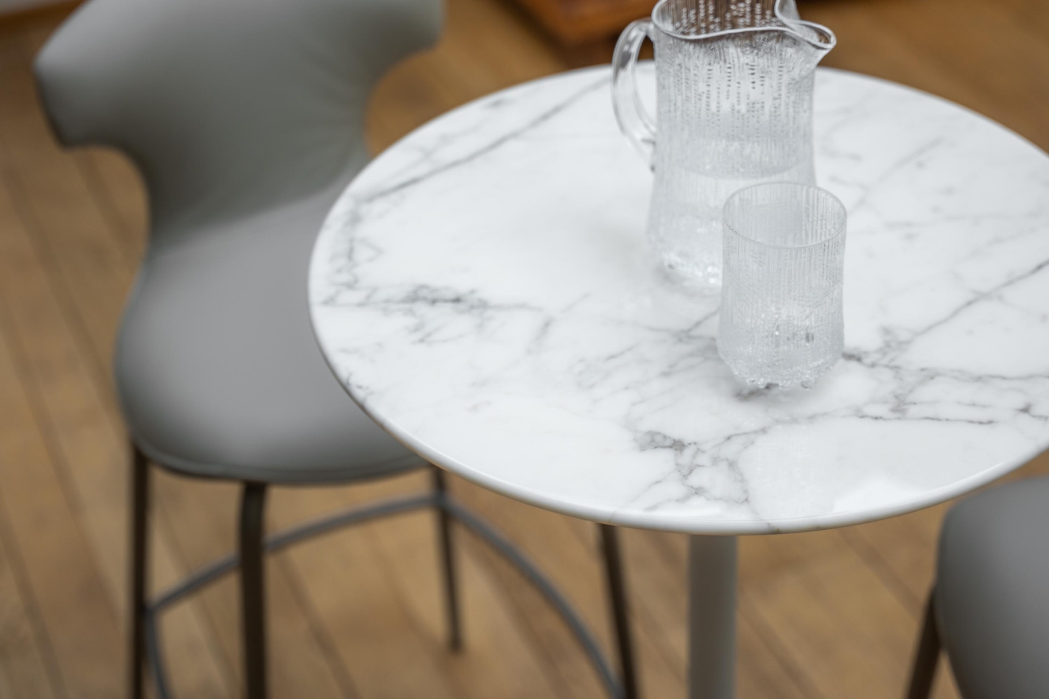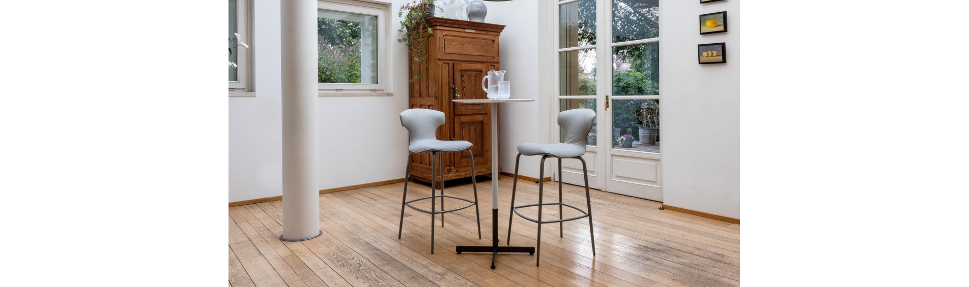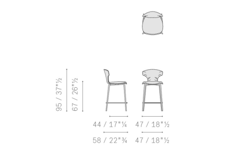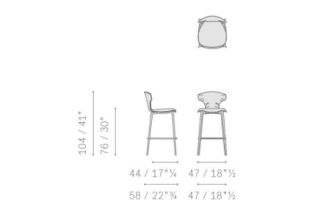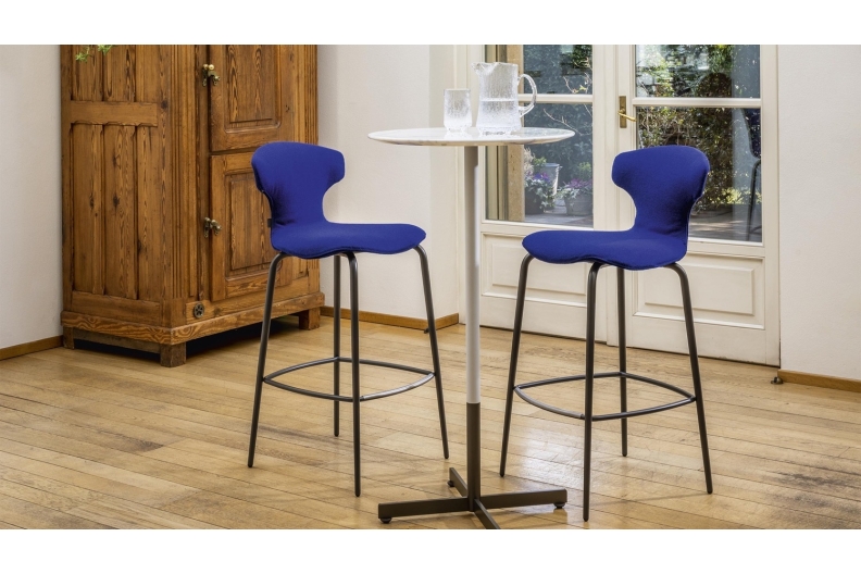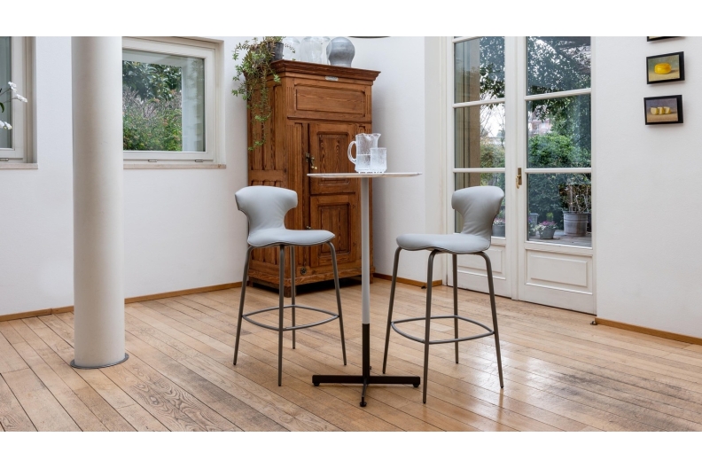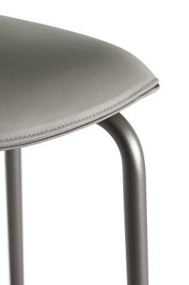 The Montera Mas stool, upholstered in Pelle Frau® leather or removable fabric, is available in two heights and is marked by the softness of the seat, made of polyurethane foam. The metal base is composed of tubular steel legs, available in multiple finishes. The legs are connected by a footrest ring in the same finish as the base and equipped with a brushed stainless steel scratch guard plate.
