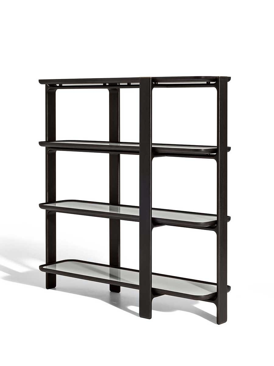 The DUO bookcase consists of staggered uprights and shelves with an ash wood frame available in different finishes. The bottom of the shelves is made of poplar plywood veneered with ash in the same finish chosen for the frame. Upon request, a marble or back-painted glass top can be inserted inside the shelf frames for an even more elegant effect. The DUO bookcase is available with four shelves or two shelves. Metal details with a shaded bronze finish add an extra touch of class and sophistication to the overall design.