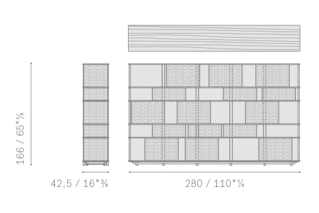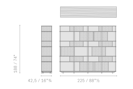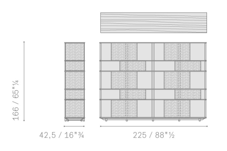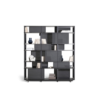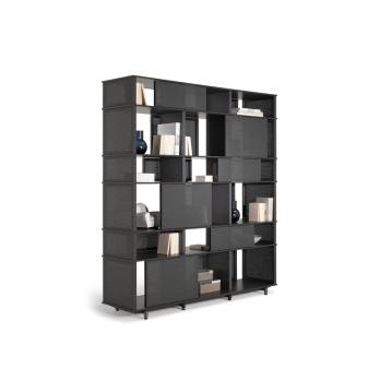 Inspired by the world of hi-fi loudspeakers, the Lloyd Tex self-supporting bookcase, designed by Jean-Marie Massaud, plays on the transparency and lightness of the Techno-fabric panels, a semi-transparent technical fabric in Light and Dark colours. The panels slide on invisible horizontal tracks, creating ever-changing sequences.