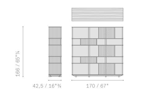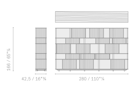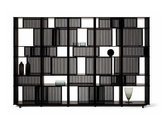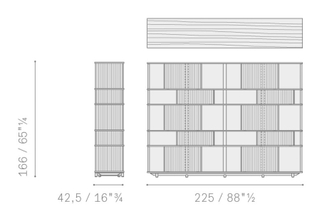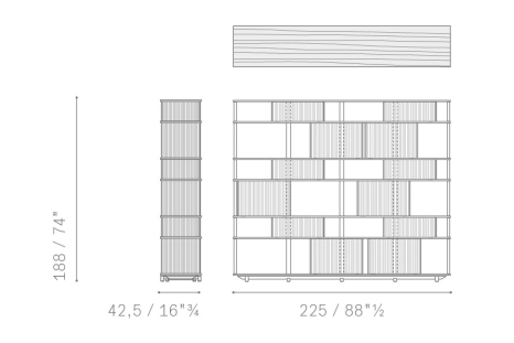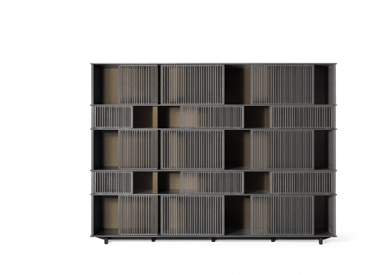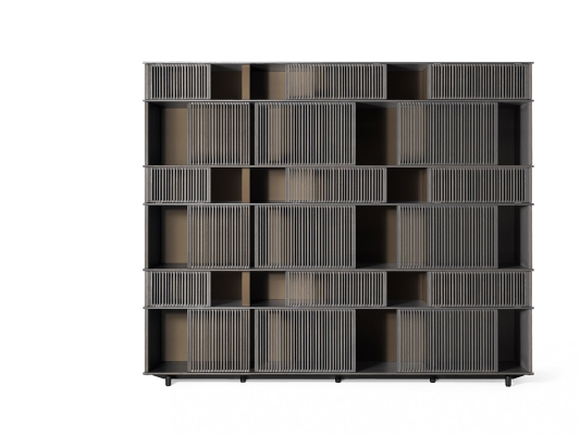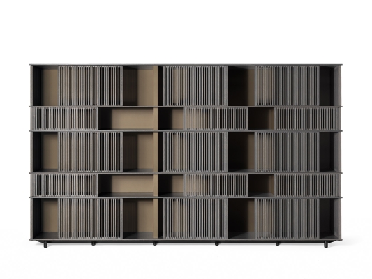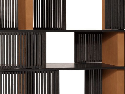 With the Lloyd storage units and bookcases Jean-Marie Massaud designs a system of variable geometries. Thin vertical wooden rods create light grilles that run from top to bottom on invisible horizontal rails. Each grille can be moved as desired to create sequences that are different each time. A fluctuating score of solids and voids, of light and shade. A sensual game that offers a glimpse of the contents, books and objects without fully revealing them. The most advanced technology is combined with traditional materials, wood and saddle leather, to form a solid and minimalist structure.