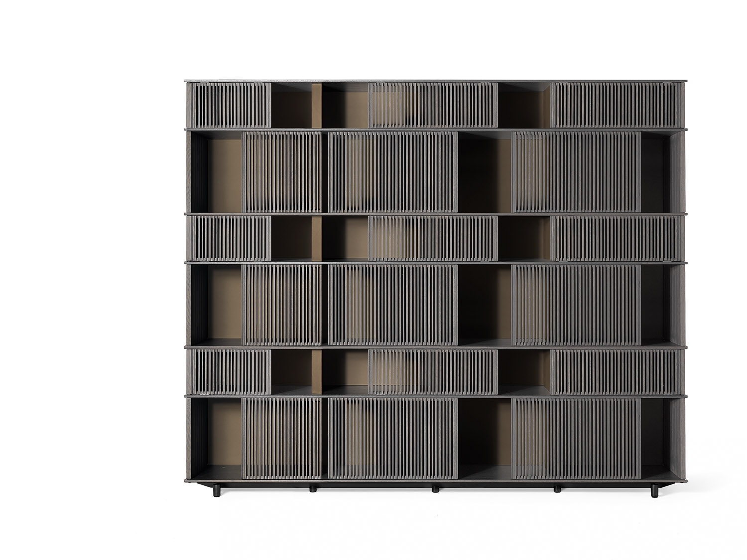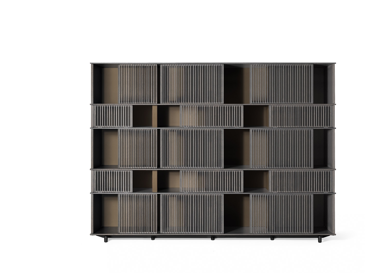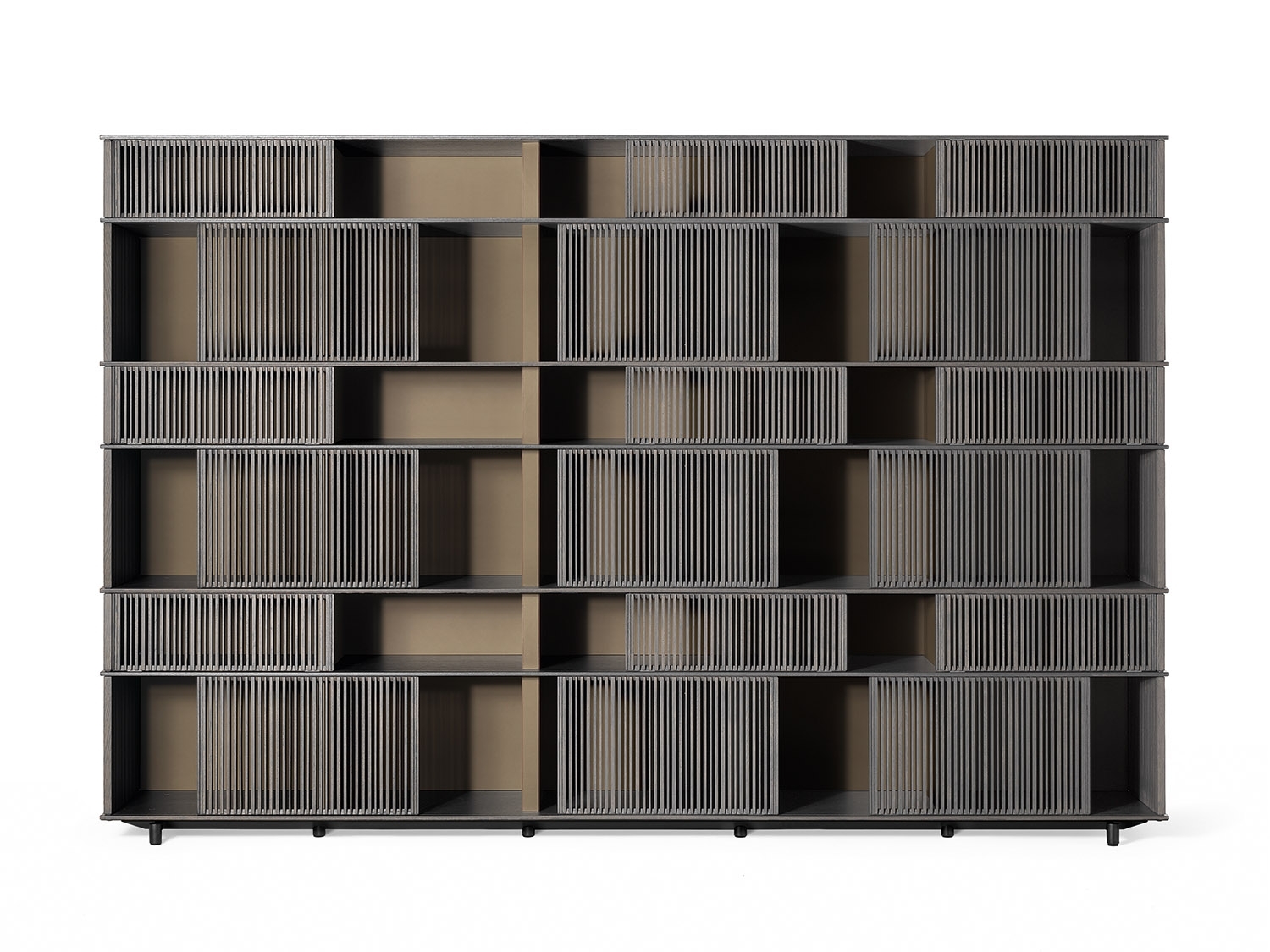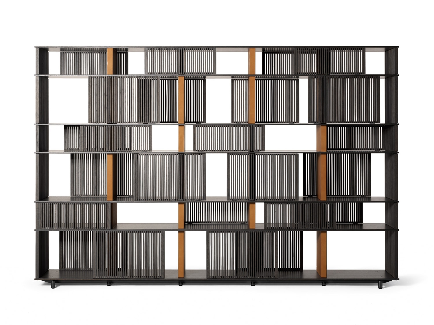 The horizontal elements on which the grilles slide are made from HPL laminate, a material which even in very thin layers guarantees stability and strength, with a natural oak veneer in a matt lead finish. The vertical saddle-leather uprights are placed at regular intervals to give the piece of furniture rhythm and enhance the liberal effect of the grilles. Each individual grille is a painstaking piece of cabinetwork. Made of solid oak, they move along rails carved into the shelves and are furnished with plastic runners to reduce friction. The solid oak rods are cut in different thicknesses and then individually glued by hand. The sides of the structure are closed by fixed solid oak grilles. The Lloyd storage units and bookcases are available in two variants: a wall version and a freestanding version. The latter has sliding grilles on both sides (front and rear). The wall version has sliding grilles on the front only while the back, in contact with the wall, is closed by a matt black lacquered MDF panel which, on the inside, can be upholstered in saddle-leather. The Lloyd bookcases and storage units have steel feet. The exterior feet at the front have a gunmetal grey finish while the central feet, set further back, have a matt black lacquer.