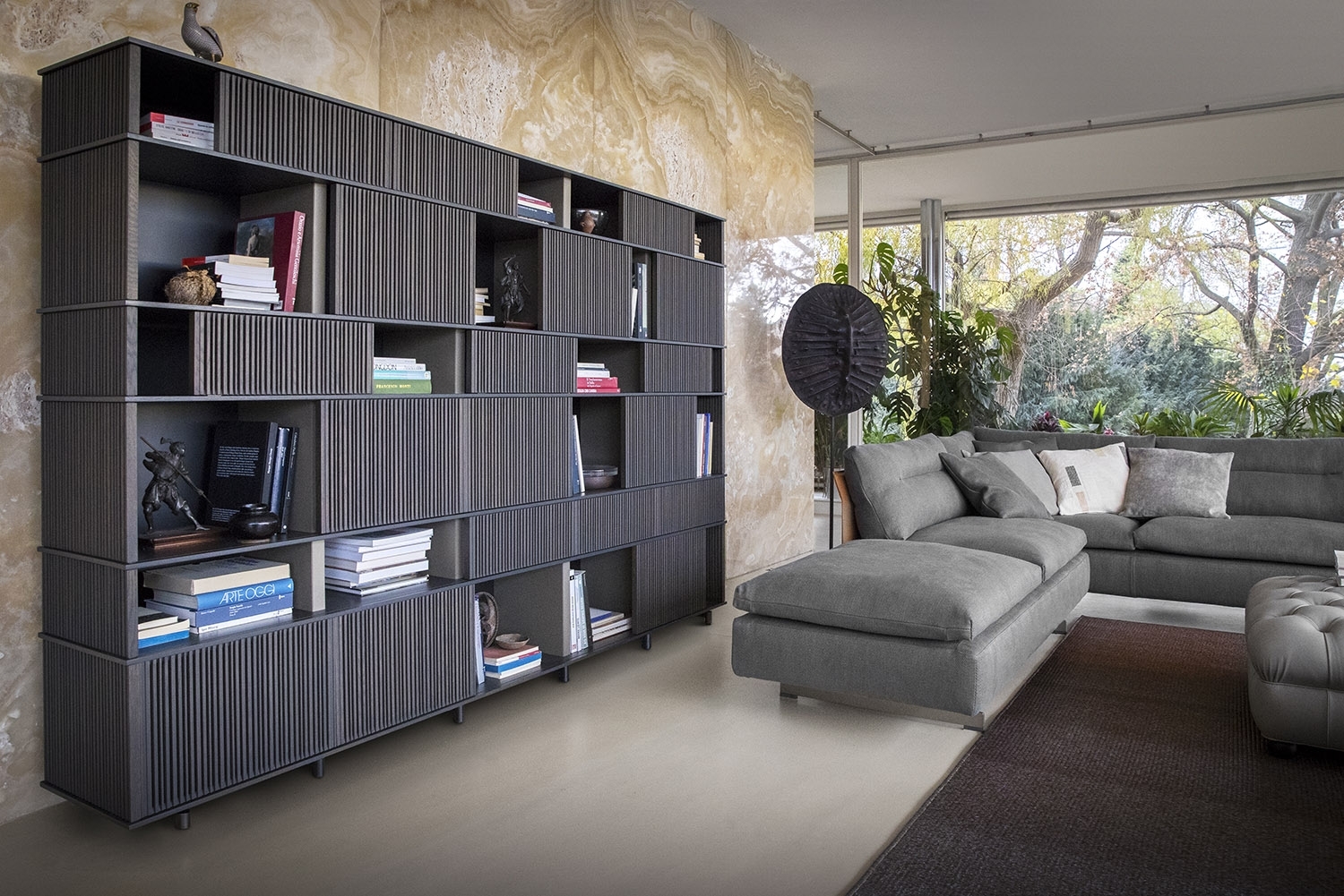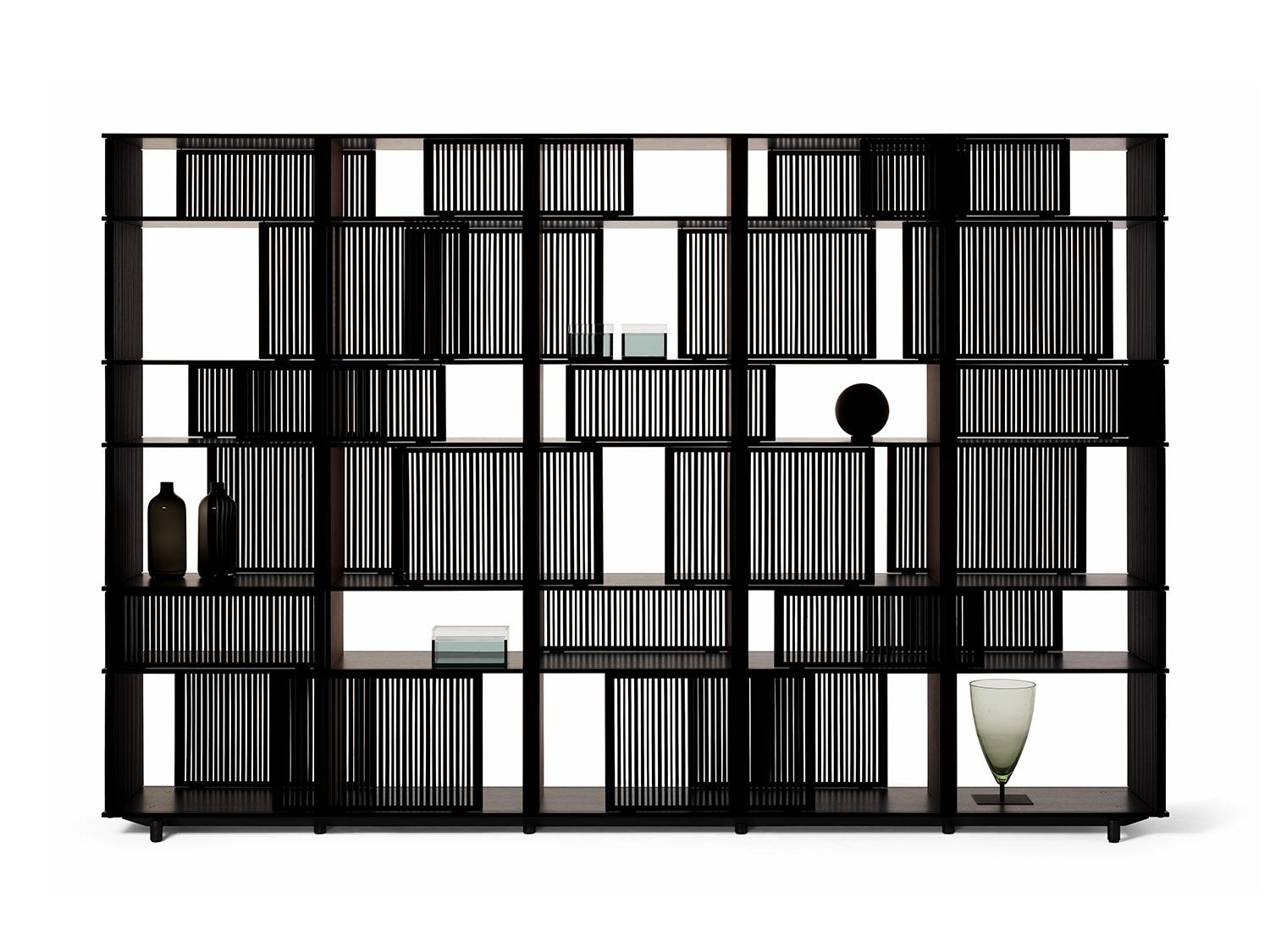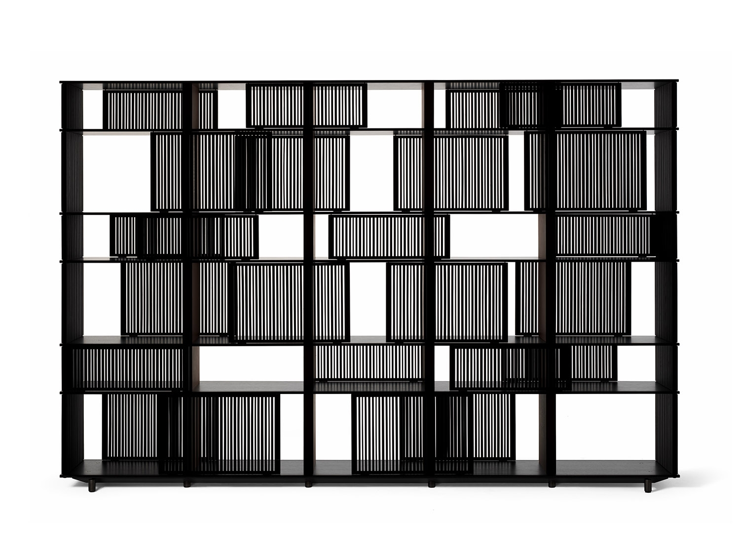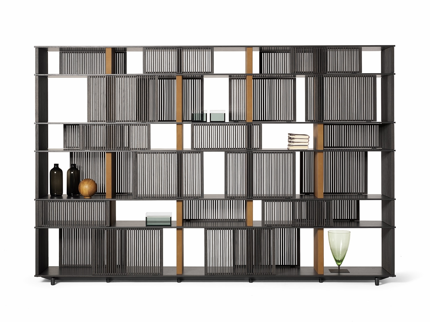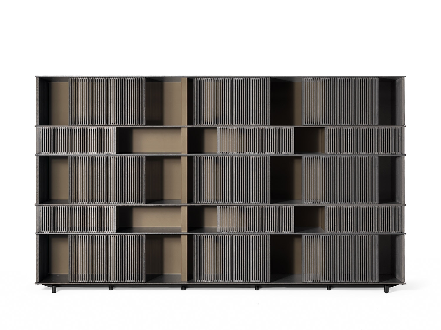 The horizontal elements on which the grilles slide are made from HPL laminate, a material which even in very thin layers guarantees stability and strength, with a natural oak veneer in a matt lead finish. The vertical saddle-leather uprights are placed at regular intervals to give the piece of furniture rhythm and enhance the liberal effect of the grilles. Each individual grille is a painstaking piece of cabinetwork. Made of solid oak, they move along rails carved into the shelves and are furnished with plastic runners to reduce friction. The solid oak rods are cut in different thicknesses and then individually glued by hand. The sides of the structure are closed by fixed solid oak grilles. The Lloyd storage units and bookcases are available in two variants: a wall version and a freestanding version. The latter has sliding grilles on both sides (front and rear). The wall version has sliding grilles on the front only while the back, in contact with the wall, is closed by a matt black lacquered MDF panel which, on the inside, can be upholstered in saddle-leather. The Lloyd bookcases and storage units have steel feet. The exterior feet at the front have a gunmetal grey finish while the central feet, set further back, have a matt black lacquer.