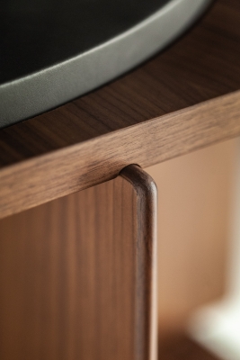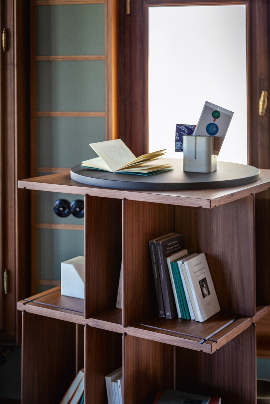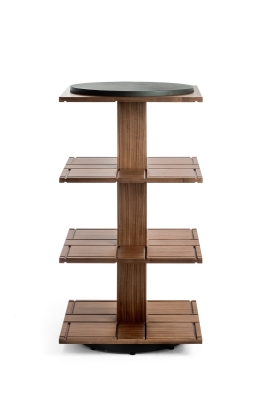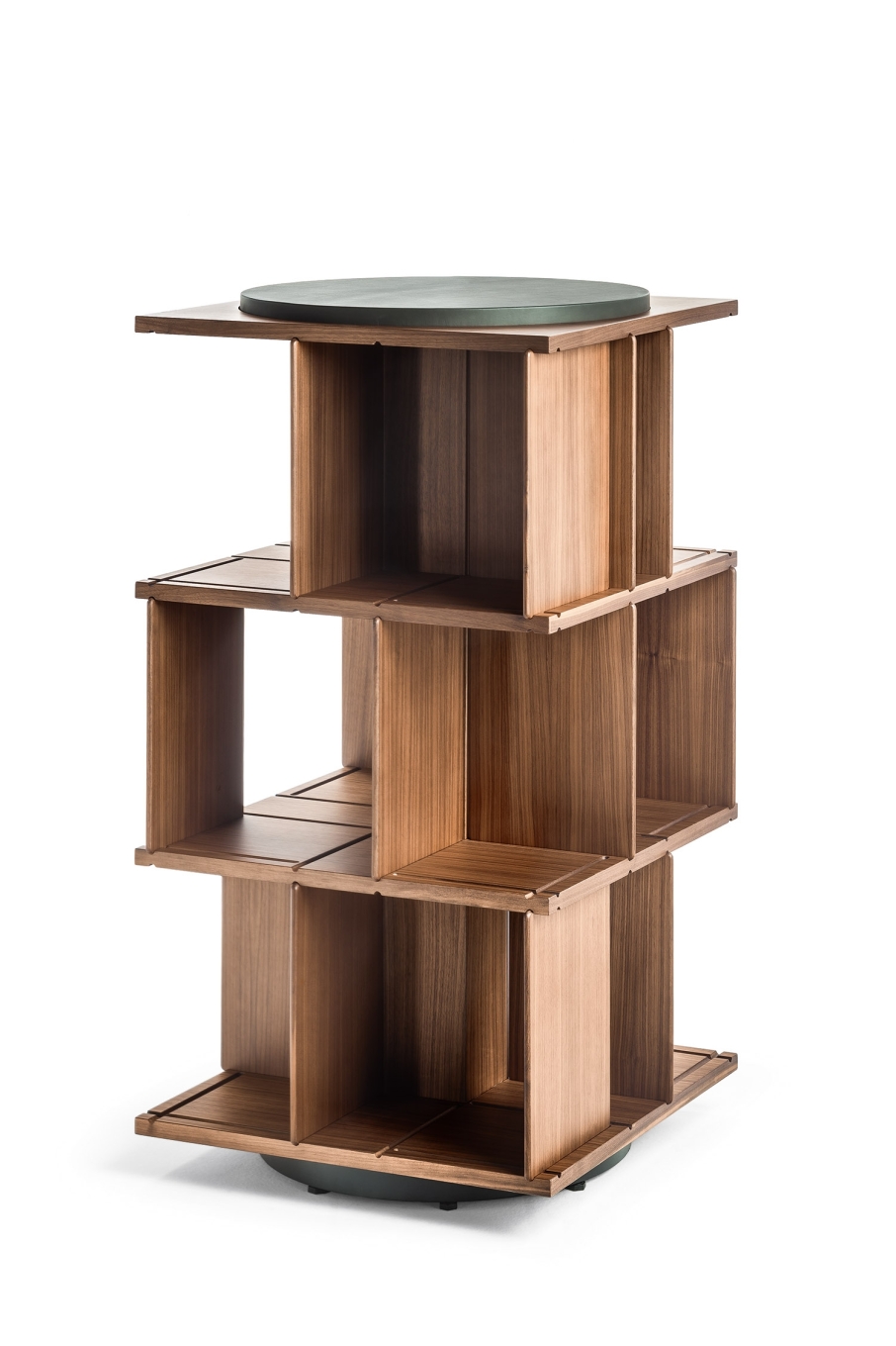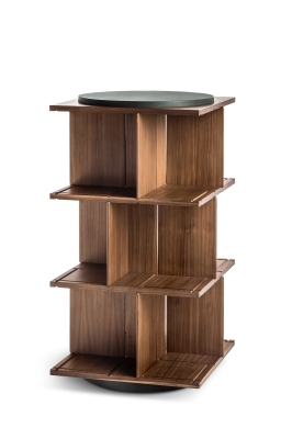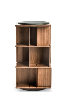 Turner is a 123 cm tall and 65 cm wide free-standing swivel bookcase. It consists of an internal supporting structure in metal enclosed in a central column made with birch plywood panels with Canaletto walnut veneer. The same materials for the intermediate shelves, furnished with solid Canaletto walnut grooves to house the 21 dividing panels, 7 for each level. The latter have solid Canaletto walnut edges. A kit of 3 additional panels can be purchased separately to further enrich the bookcase. The top is in birch plywood covered with a double layer of Canaletto walnut refined in the lower part to act as a counterbalance. It is crowned with a circular rotating surface made from MDF and covered with precious Pelle Frau® SC leather or Saddle Executive leather. The circular base is made from black painted steel. The bookcase is completed by the Poltrona Frau logo and the signature of the architect, laser-engraved at the centre of the column under the top.