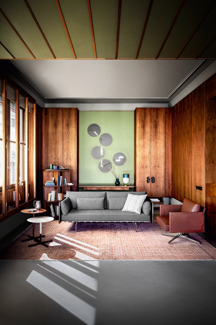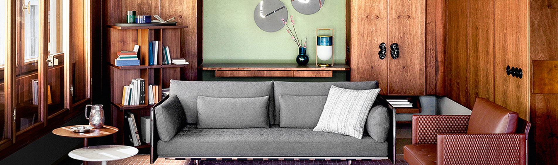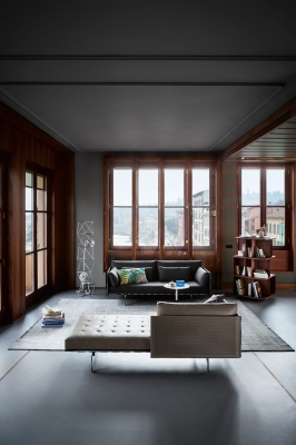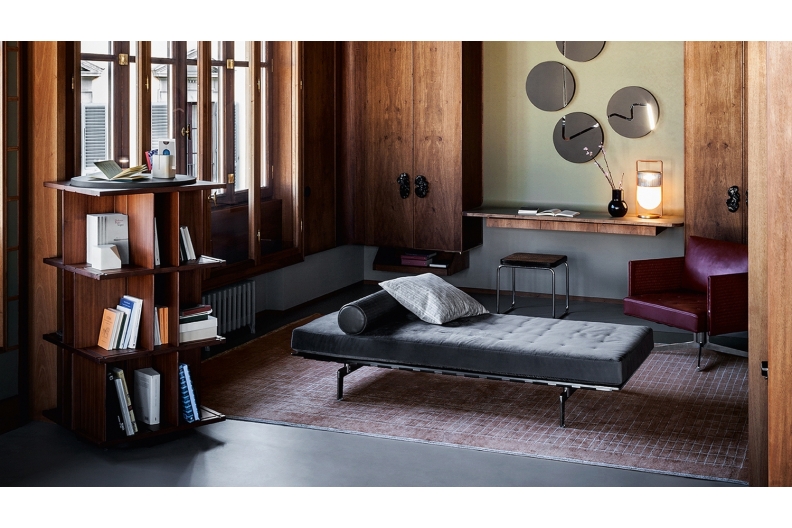 Inspired by the classic English freestanding bookcases, perfect for keeping your most treasured books close by at all times, the Turner swivel bookcase nonetheless boasts a cutting-edge design. The 3-level supporting structure rises vertically like a building, each floor furnished with grooves that act as rails and enable you to add or remove a series of dividing panels to create different combinations as you desire in an ever-changing game of solids and voids. Poltrona Frau is delighted to present the reissue, modernised in terms of its materials but developed with the utmost care and philological respect.