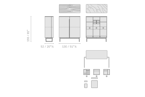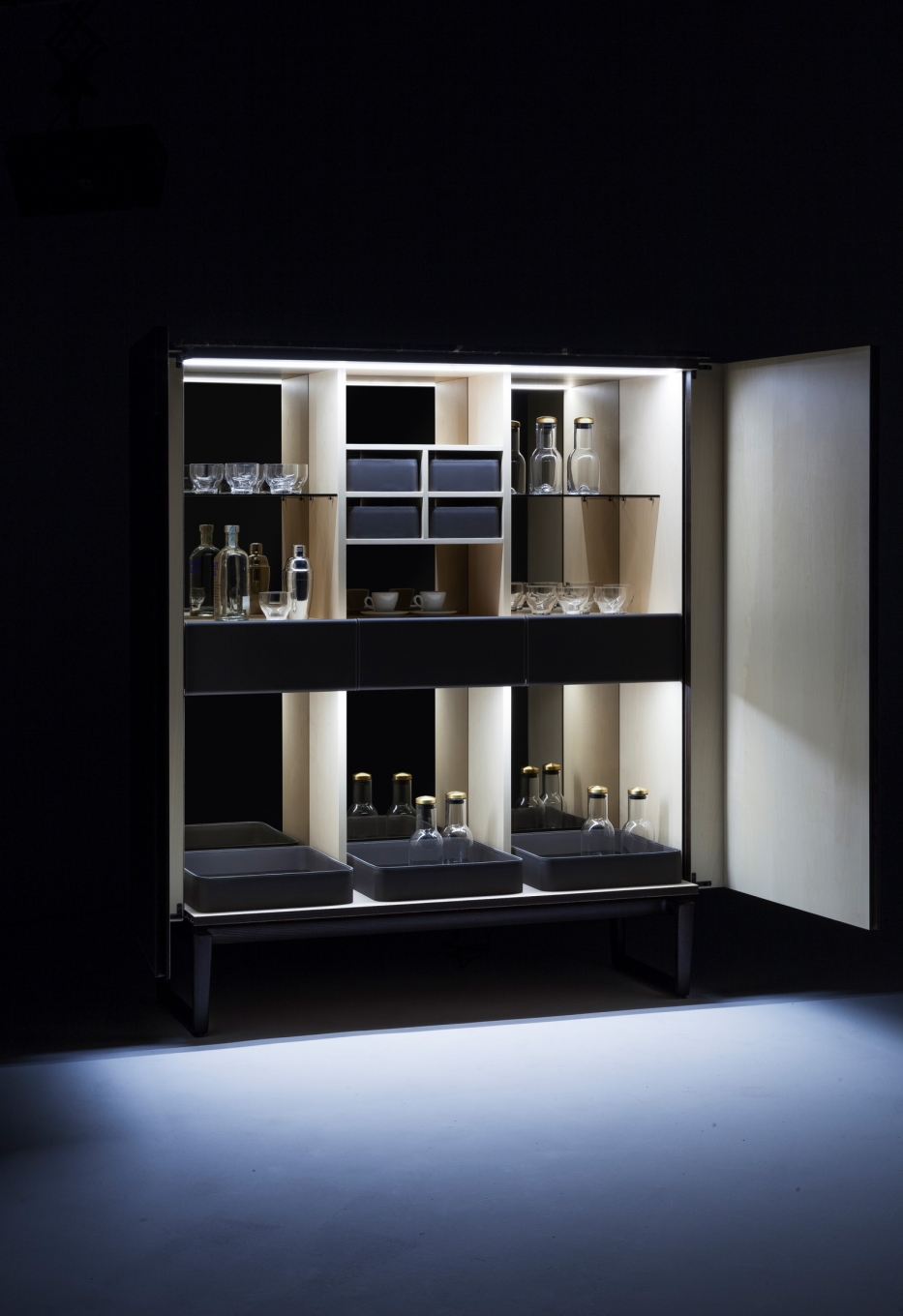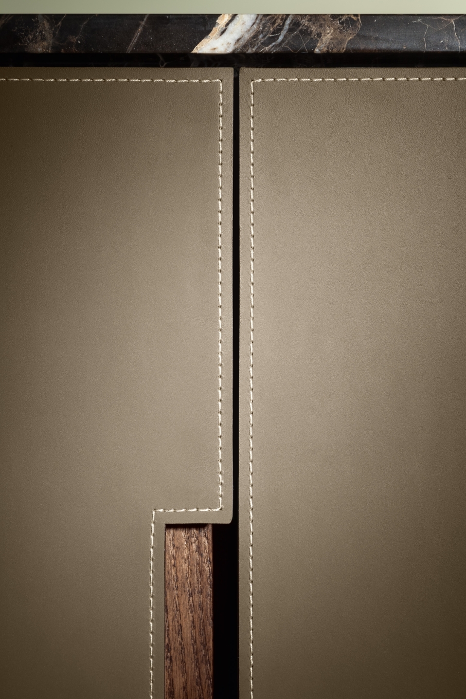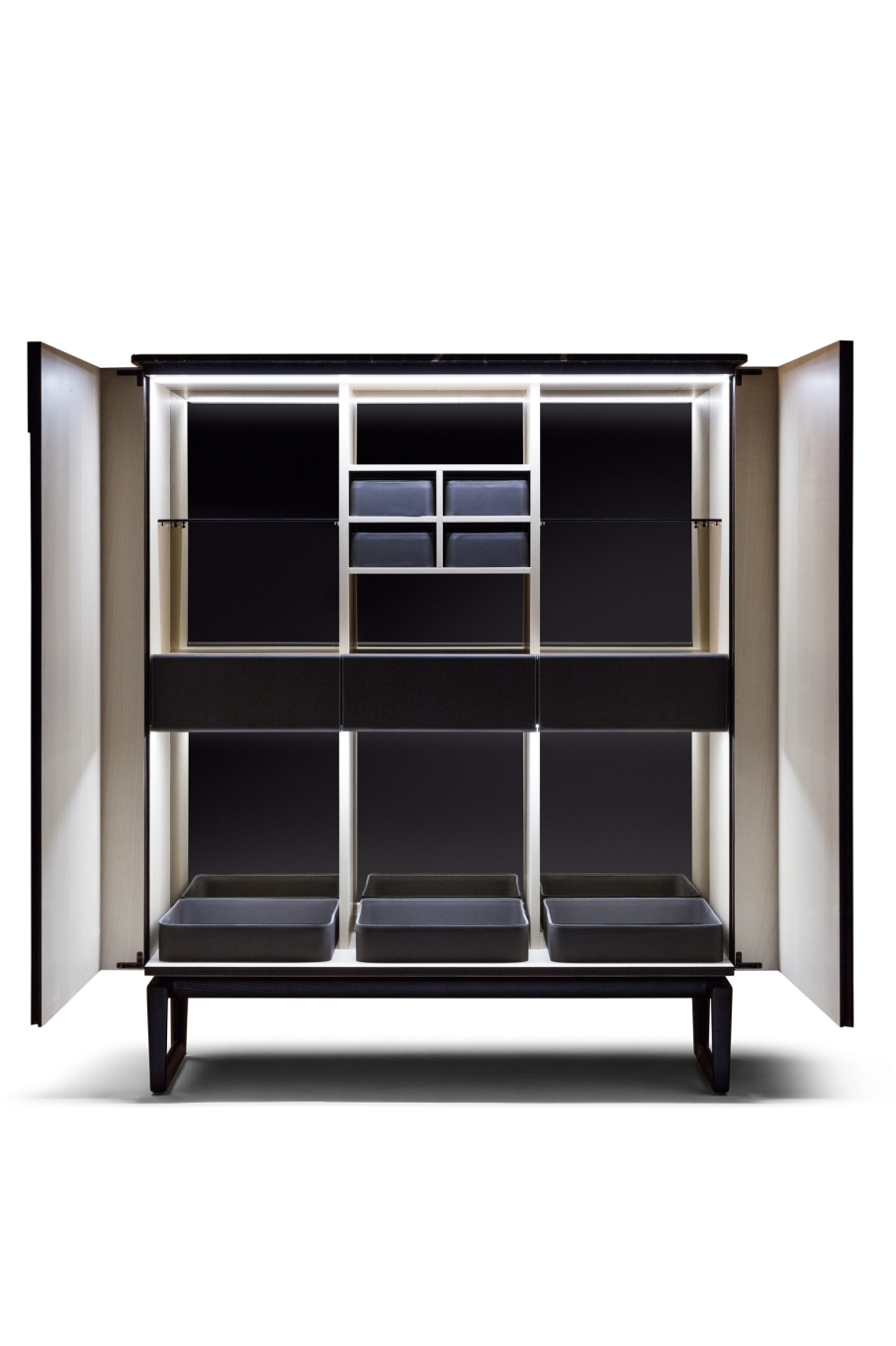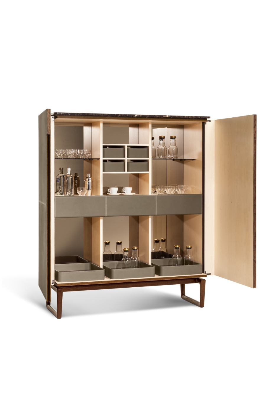 The collection includes the Low Cabinet, the High Cabinet and the Fidelio Mobile Bar. The supporting structure is in solid ash and birch plywood with moka-coloured ash veneer on the outside. The extra light natural maple wood brightens the interior. The doors are in birch plywood and poplar with the insides veneered in moka-stained ash for the Fidelio Low Cabinet and extra light natural cut maple wood in the Fidelio High Cabinet. The edging of the doors is produced from solid ash in a moka stain. The top is available in moka-stained ash, in glossy or semi-glossy Calacatta gold marble and in glossy Emperador marble. The sawhorse base, in moka-stained solid ash with triangular cross-section, adds to the light feel of the design. The base is fixed to the structure with cylindrical spacers in matt black painted steel. The adjustable steel feet have rubber caps. Fine saddle-leather is used to upholster the sides, doors, inside drawers and, on request, the back of the cabinet. Choice between tone-on-tone or contrast stitching. The inside of the Fidelio Mobile Bar is designed to lighten up when the doors are opened. The back wall of the cabinet is covered with two bronzed mirrors.