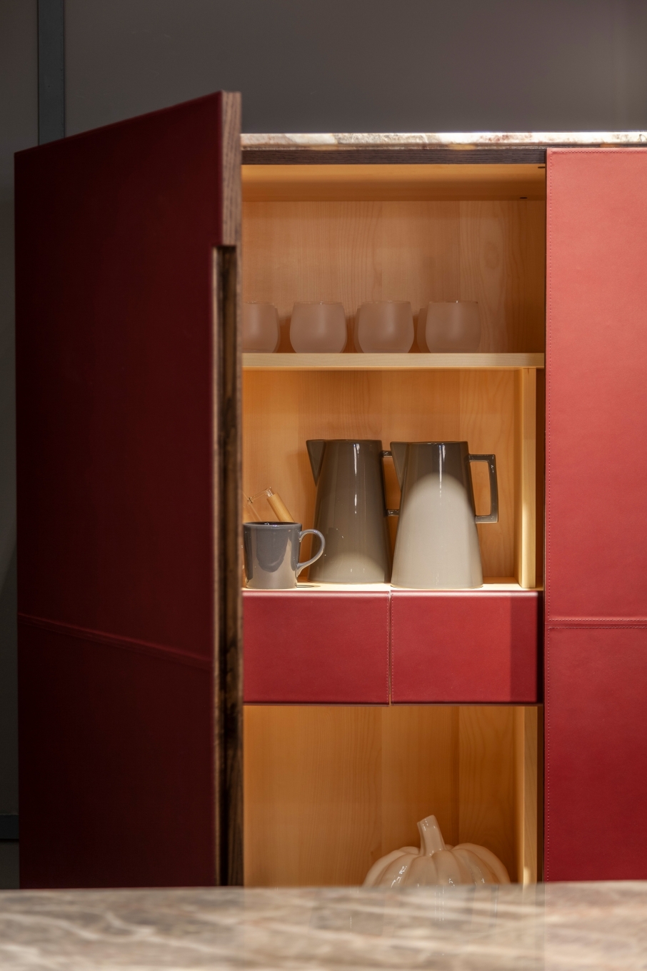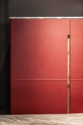 When designing the Fidelio series (Low Cabinet, High Cabinet and Mobile Bar), Roberto Lazzeroni opted for a deliberately clean design combined with precious materials: formal simplicity and sophisticated finishes for a versatile collection that is easy to combine with all other Poltrona Frau furnishings. The functional details become highly distinctive aesthetic elements, like the recessed handles on the surfaces. There is also the intense contrast between the warm, dark tones of the saddle-leather and wood that covers the exteriors, and the luminous explosion of the light natural maple that reveals itself in the compartments.