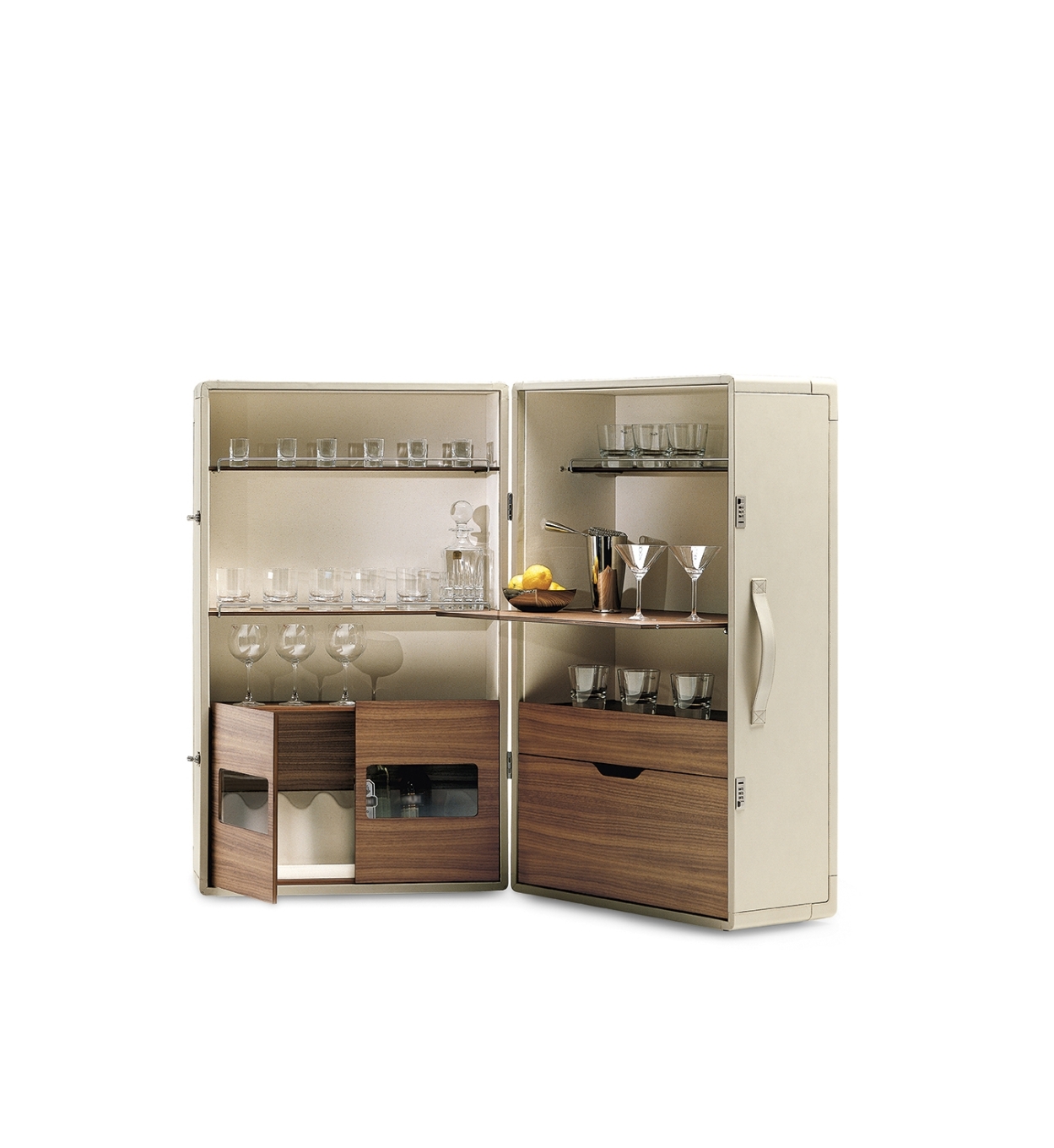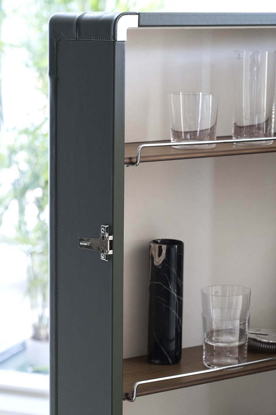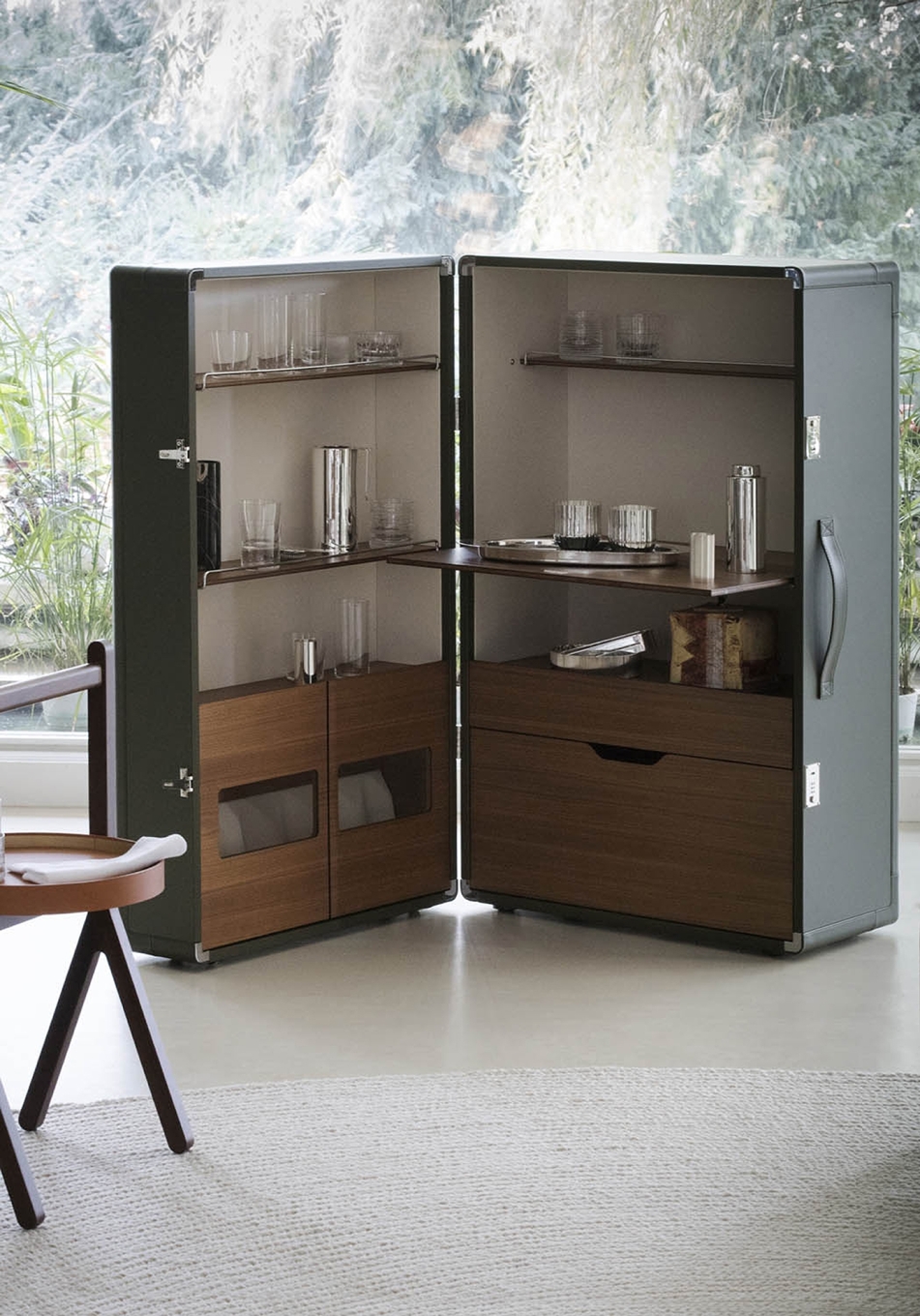 With the Isidoro mobile bar, cocktail hour returns to the home with a personal and convivial feel. A retro element given a contemporary makeover by Jean-Marie Massaud. Isidoro is an elegant cabinet on wheels that opens like a book. It has an external handle and click-to-close mechanism. A valuable item, made with fine materials and carefully studied down to the finest of details. The internal spaces are painstakingly constructed and include glass and bottle holder compartments with mini metal railings. A foldable shelf can be used as a practical worktop.