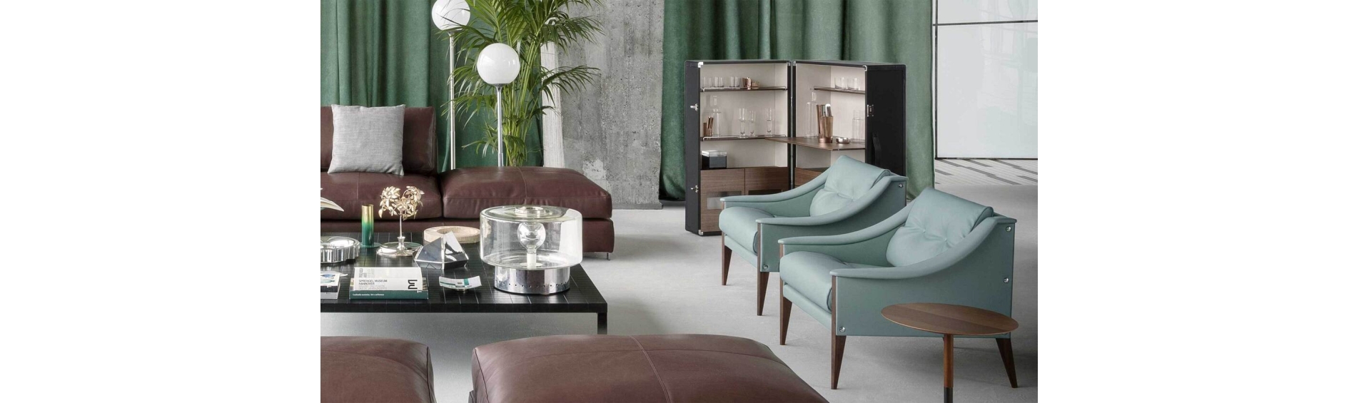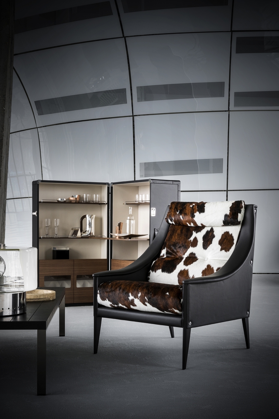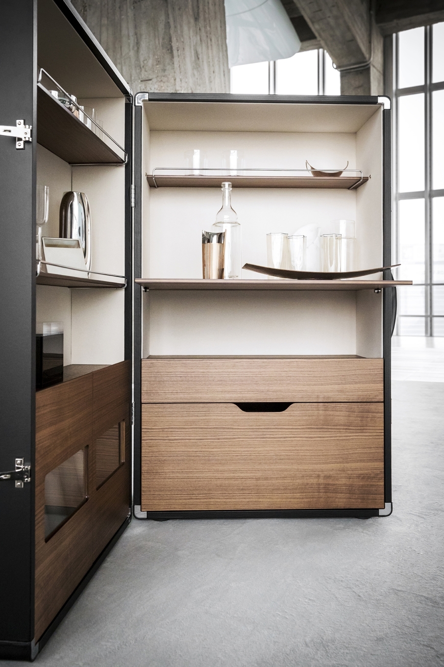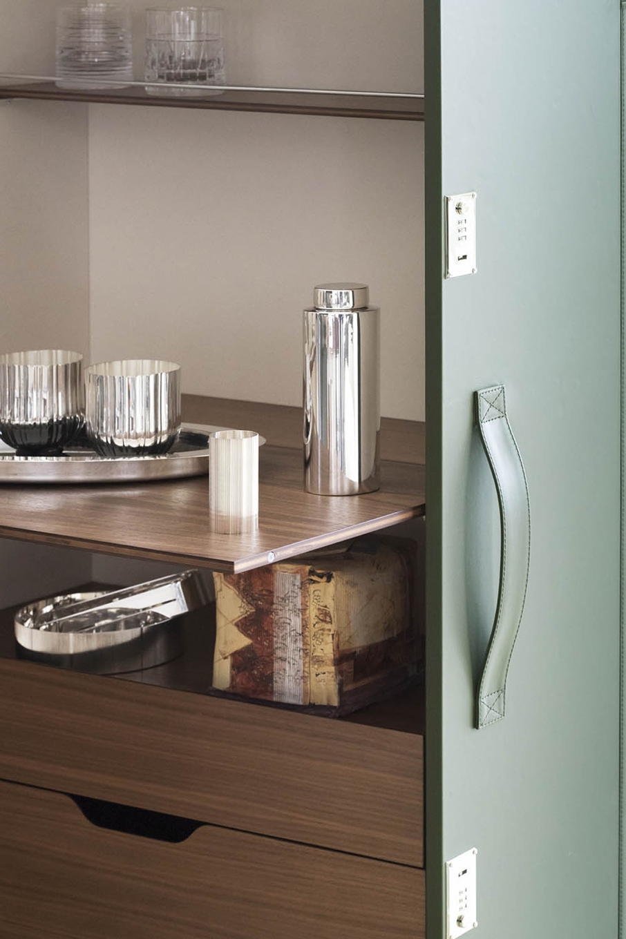 With the Isidoro mobile bar, cocktail hour returns to the home with a personal and convivial feel. A retro element given a contemporary makeover by Jean-Marie Massaud. Isidoro is an elegant cabinet on wheels that opens like a book. It has an external handle and click-to-close mechanism. A valuable item, made with fine materials and carefully studied down to the finest of details. The internal spaces are painstakingly constructed and include glass and bottle holder compartments with mini metal railings. A foldable shelf can be used as a practical worktop.