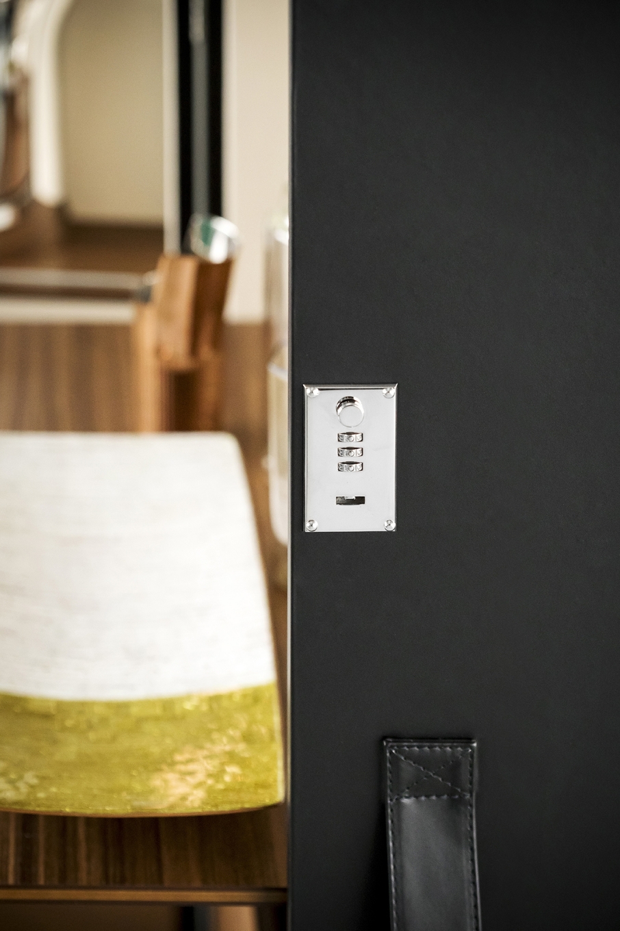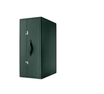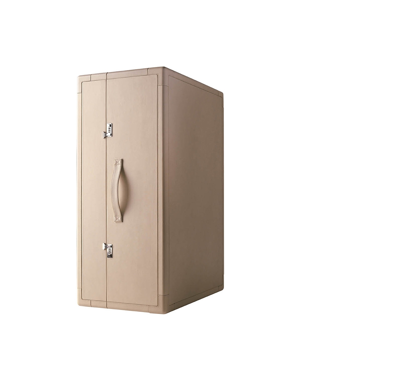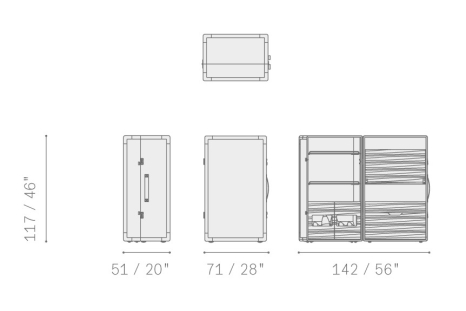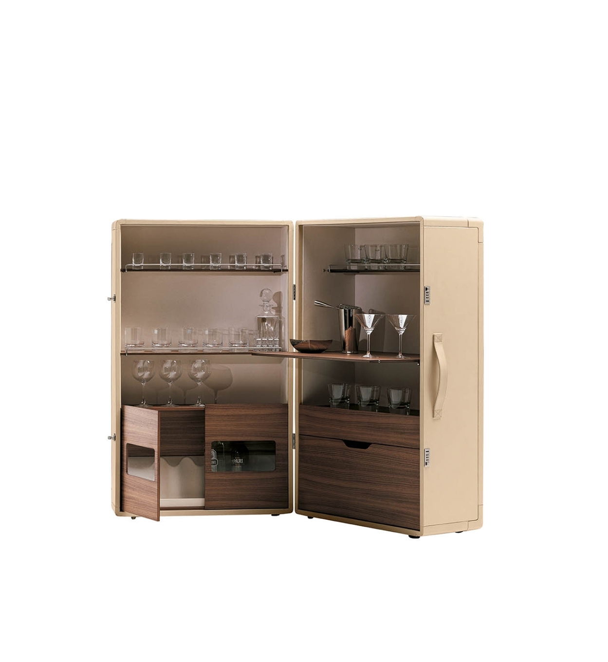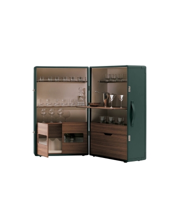 The structure of the Isidoro mobile bar is made of poplar plywood panelling. The exterior upholstery is in saddle-leather while canvas elegantly decorates the inside walls. Shelves and drawers in poplar plywood with Canaletto walnut veneer. The glass and bottle holder compartments are enriched with mini chromium-plated metal railings. The feet are made of plastic: they have caps for the stationary part while the part that opens has swivel castors. A pair of click-to-close mechanisms with combination ensure the perfect closure of the cabinet.