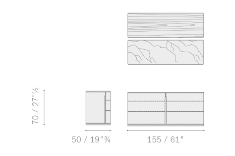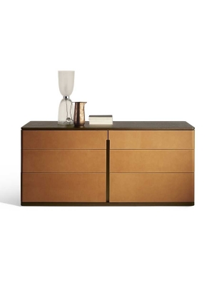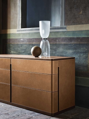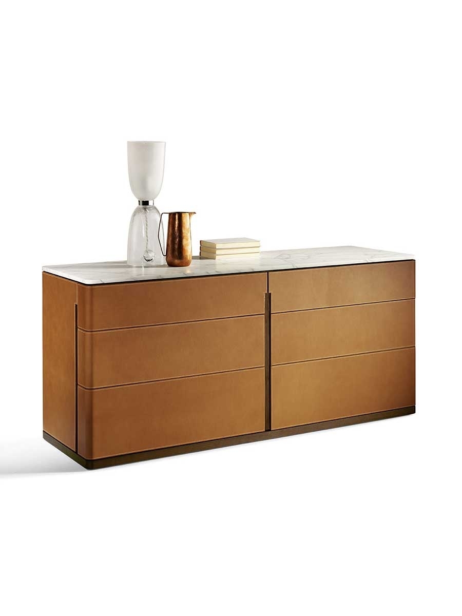 The Fidelio Notte chest of drawers features a supporting structure made of solid Canaletto walnut and birch plywood with Canaletto walnut veneer. The outer parts of the drawers and the sides are upholstered in leather, with either tone-on-tone or contrasting stitching. The back can be finished in leather or Canaletto walnut. The top is available in Canaletto walnut or marble in various finishes.