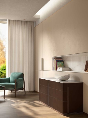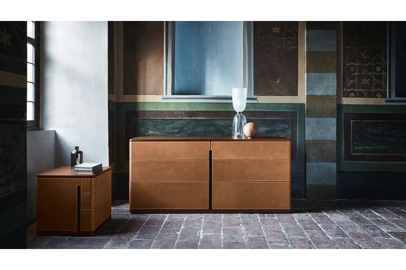 Fidelio Notte: chest of drawers, tall boy and bedside table for the bedroom. As with the rest of the Fidelio series, the designs are clean and the materials fine. Roberto Lazzeroni uses functional details to create highly distinctive aesthetic elements, like the recessed handles on the surfaces.