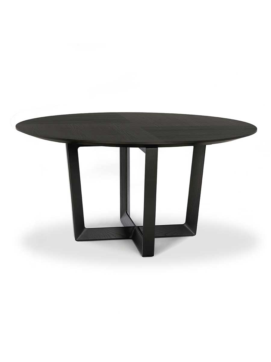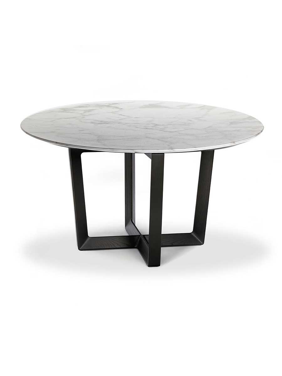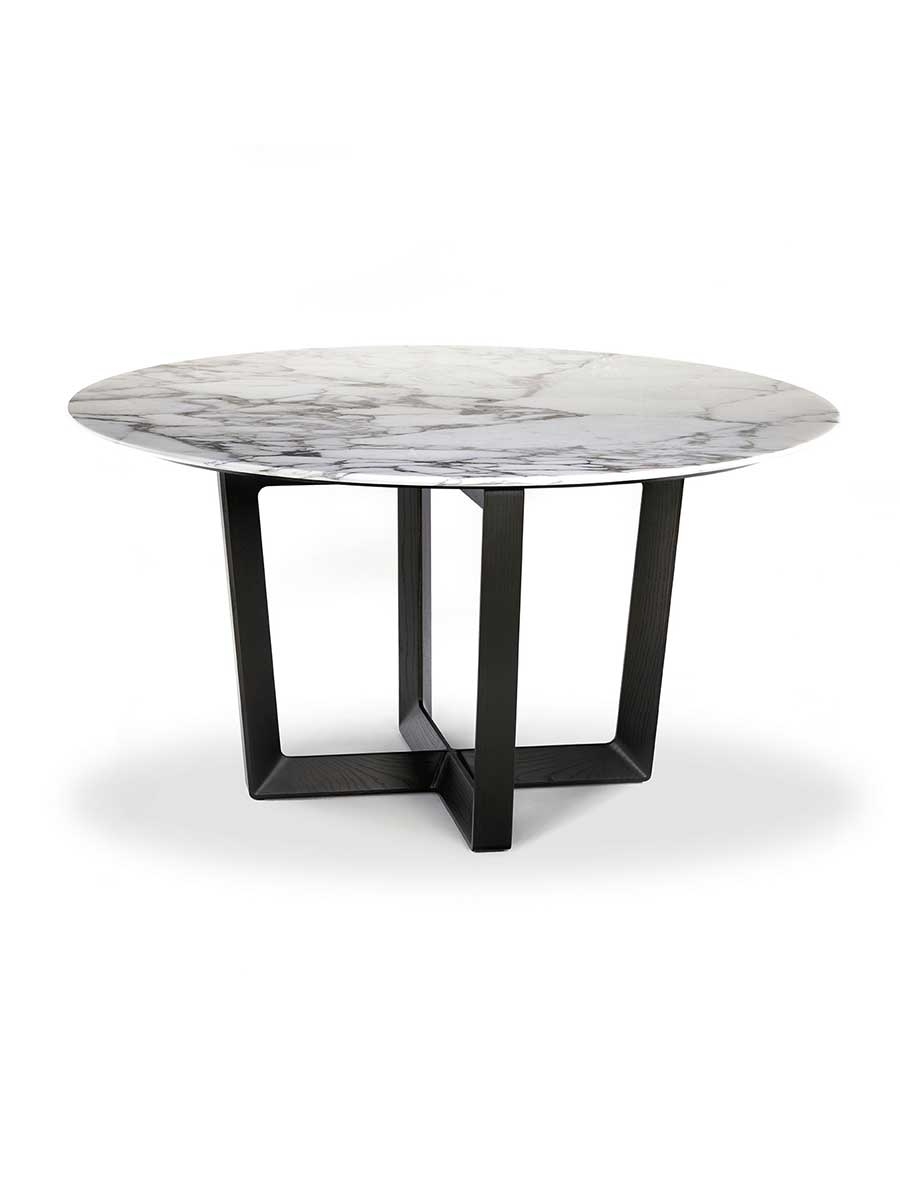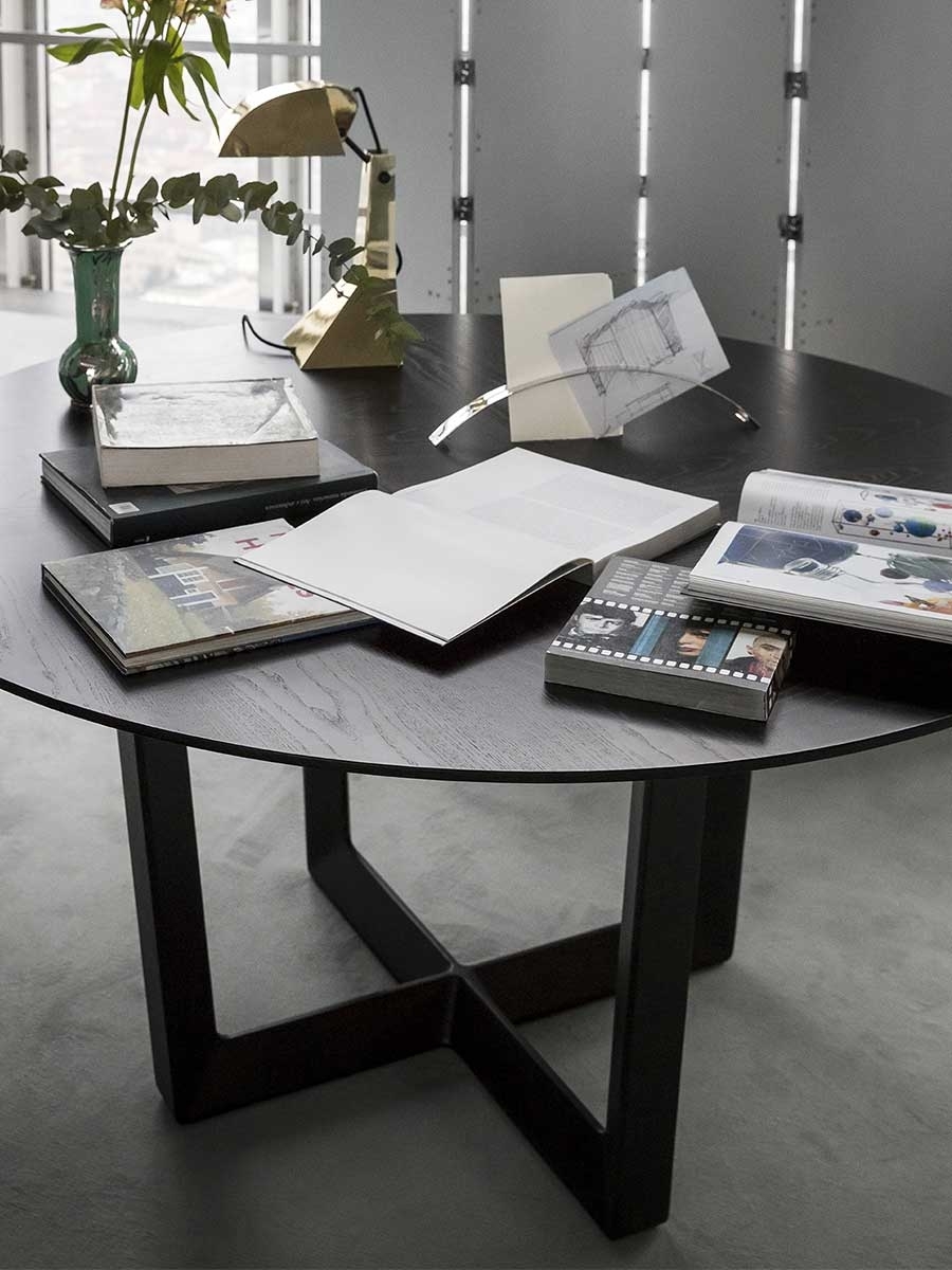 The supporting structure of the round Bolero table is made of solid wood, available in various finishes, with a triangular section profile. The top can be made of wood, wengé-stained ash, or Canaletto walnut, with a solid wood edging in the same finish that refines the border. For the 150 cm diameter version, the top is also available in marble with a beveled edge, in glossy and semi-glossy finishes.