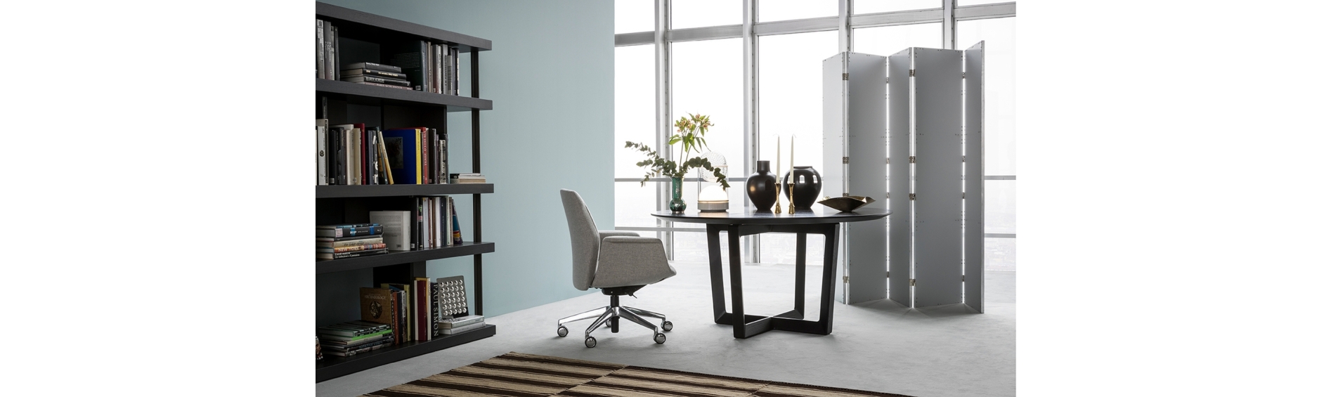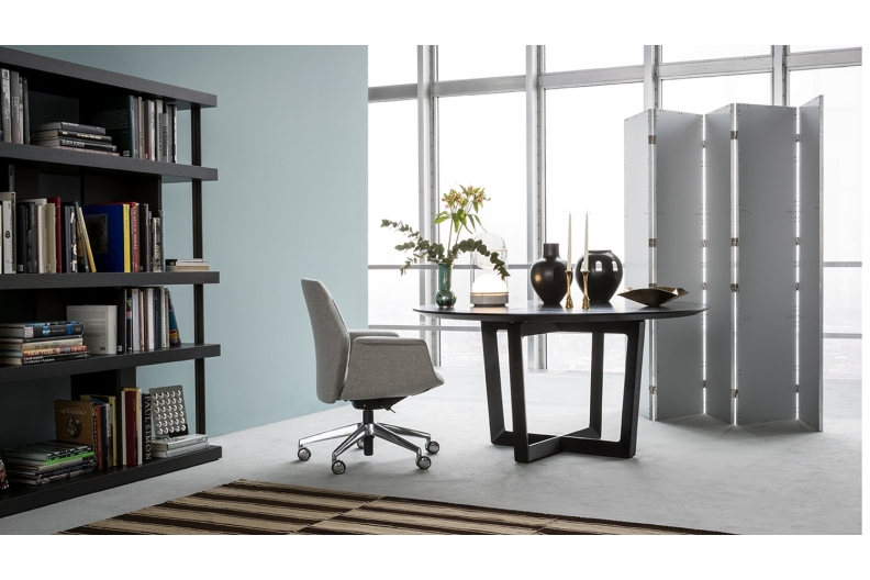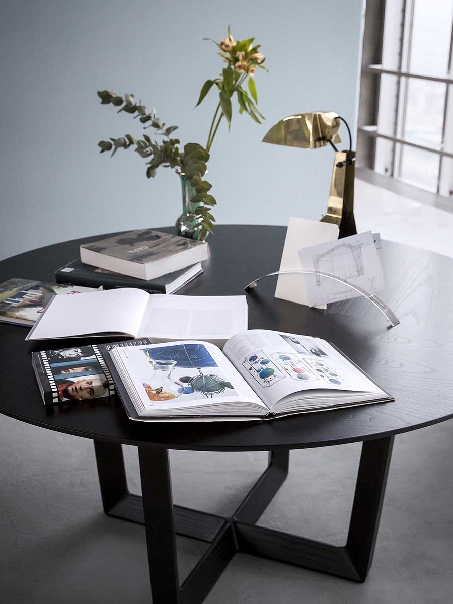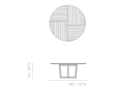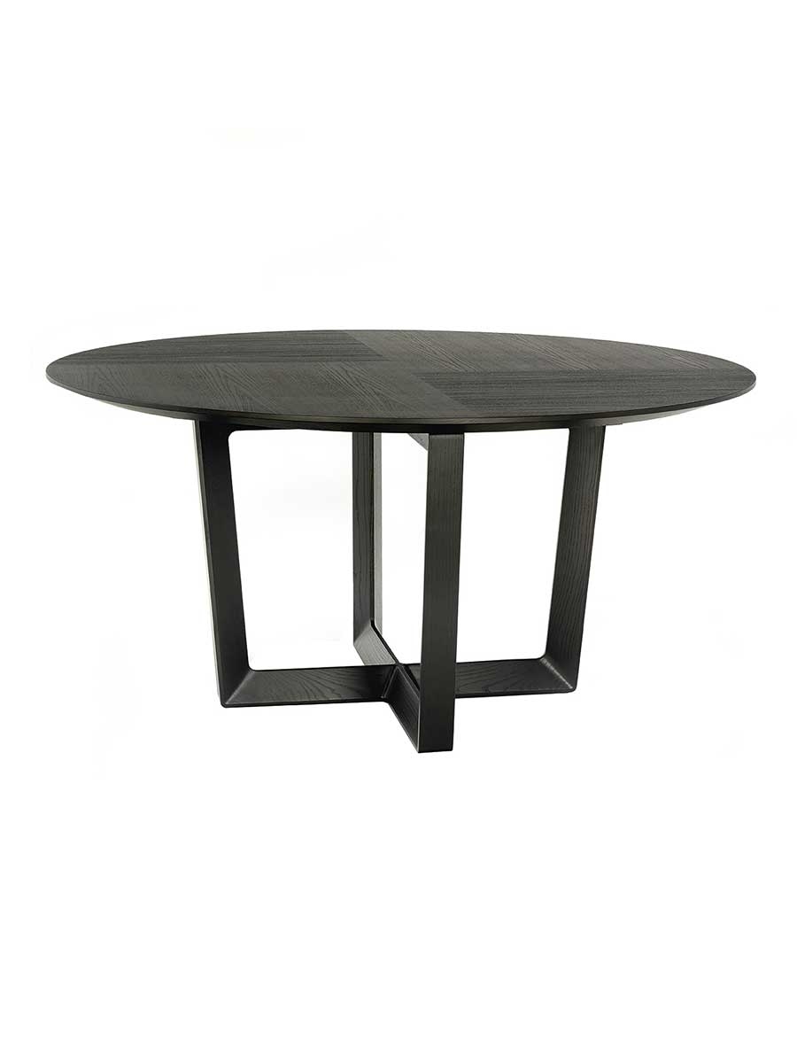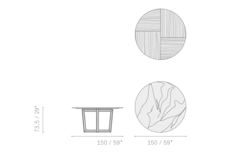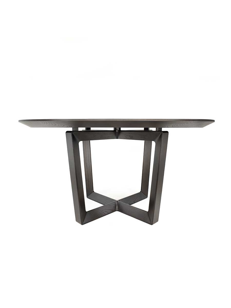 The supporting structure of the round Bolero table is made of solid wood, available in various finishes, with a triangular section profile. The top can be made of wood, wengé-stained ash, or Canaletto walnut, with a solid wood edging in the same finish that refines the border. For the 150 cm diameter version, the top is also available in marble with a beveled edge, in glossy and semi-glossy finishes.
