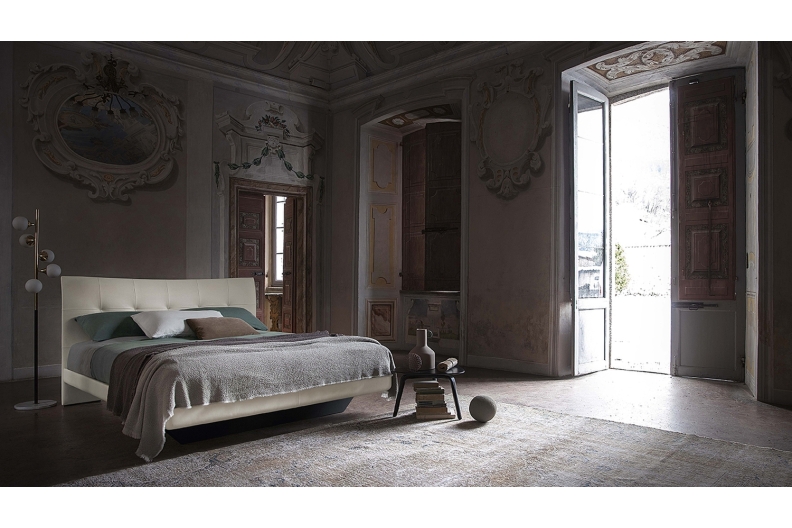 base is lightly padded in polyurethane foam with spruce blockboard for the sides and poplar plywood for the footboard. The front corners are enriched with a leather trim. The back feet of the Aurora Due bed are formed from the headboard, which extends down to the floor, while the front base is in wood with black scratchproof paint and consists of a single trapezoid the same width as the bed. The metal base is the same shape but hollow inside and available with black, gunmetal grey and chromium-plated finishes.
