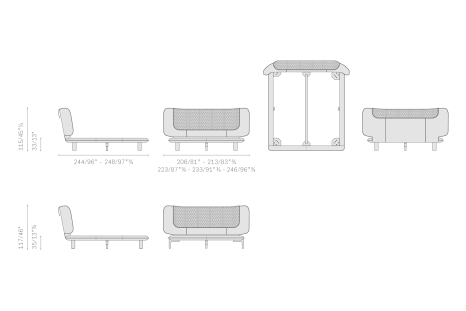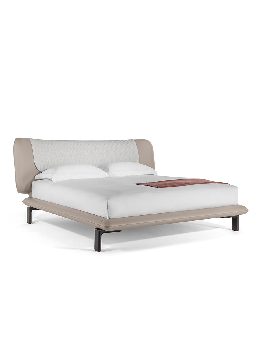 The DUO designer bed reinterprets the hallmark elements of the DUO collection, such as the curved lines, seen here in the headboard. The structure is made of steel, with a base composed of struts in lime or tulip wood. A light layer of padding wraps around the entire profile of the base. The suspended padded headboard extends beyond the frame, creating a wraparound effect, and features removable decorative quilting with matalassé stitching. The cylindrical legs are made of aluminum, upholstered in Pelle Frau® leather to match the bed. The DUO leather bed is available in different sizes and upholstery options. The Poltrona Frau logo is hot-stamped on the back of the headboard.