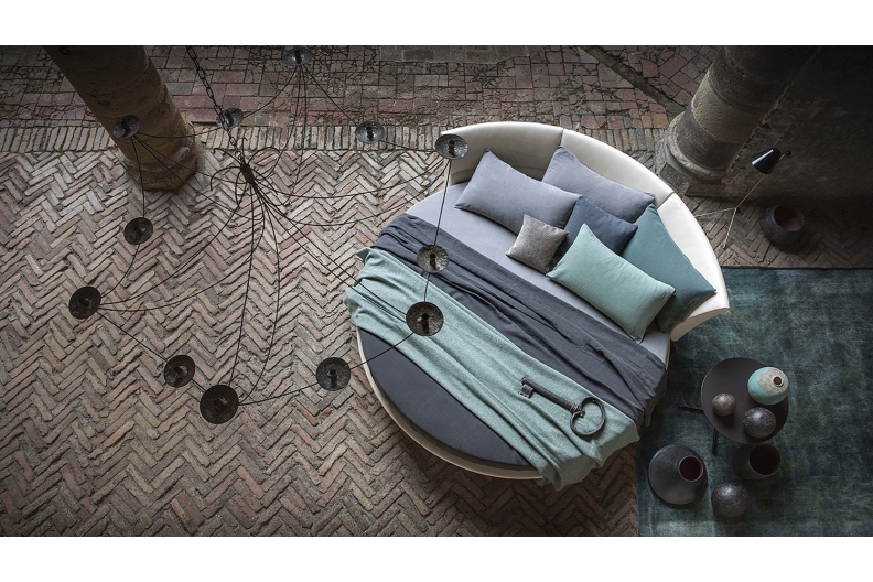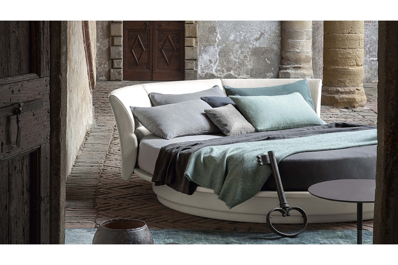 The bedhead of the Lullaby Due has a wing silhouette and is cadenced with visible stitching. Its structure is made from steel with moulded polyurethane foam padding. The bedhead is mounted on the swivel base which can turn 360°, both clockwise and anticlockwise, thanks to a swivel mechanism inside the base. The Lullaby Due’s base is made from poplar plywood and padded with polyurethane foam. The mattress supplied, diameter 220 cm x 20 cm height (see “Beds and mattresses diagram”), is composed of steel pocket springs with wool padding for the winter side and cotton padding for the summer side. The bedstead base is made from plywood with padding in polyurethane foam and upholstery in Poltrona Frau canvas. The Lullaby Due bed is upholstered in Pelle Frau® leather.