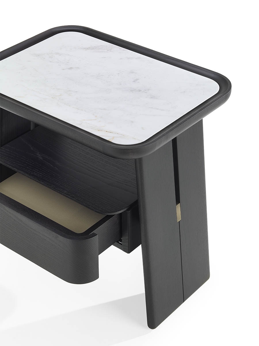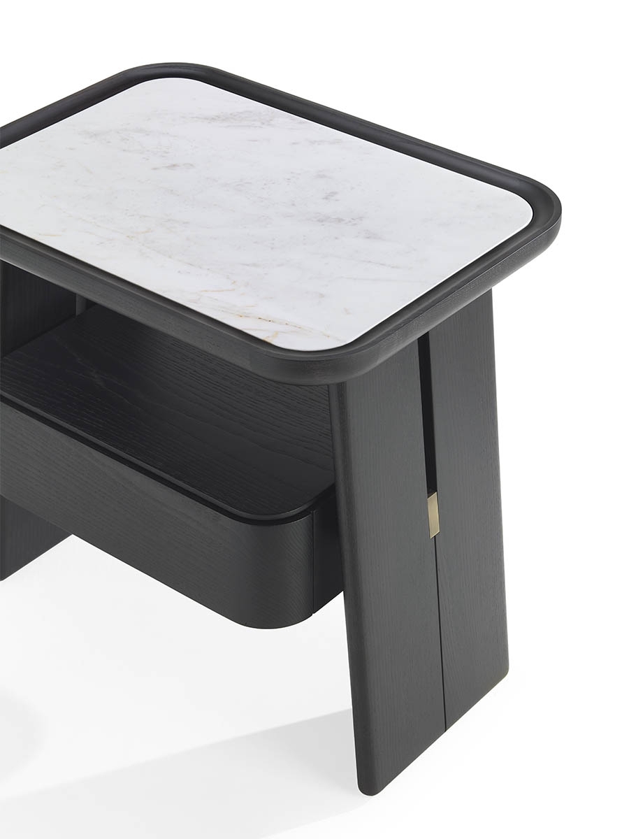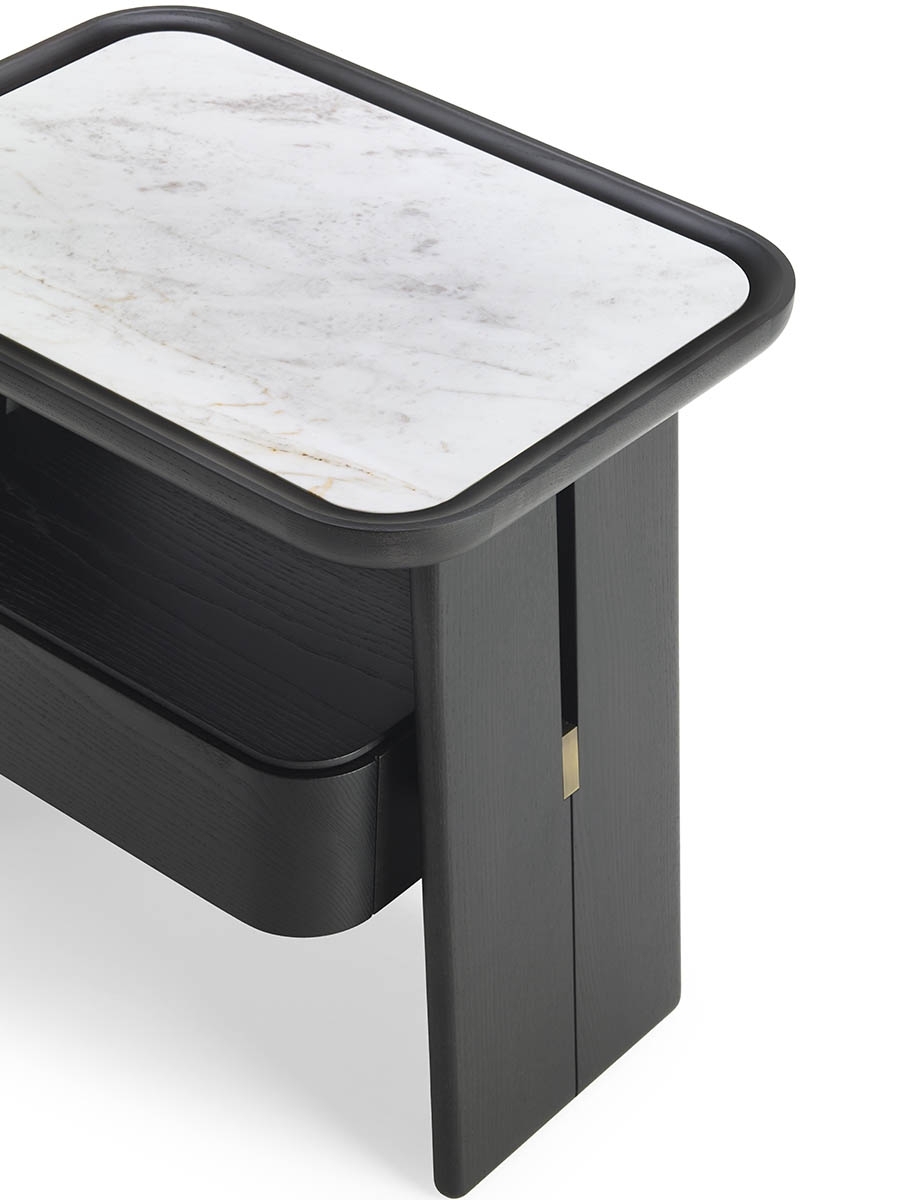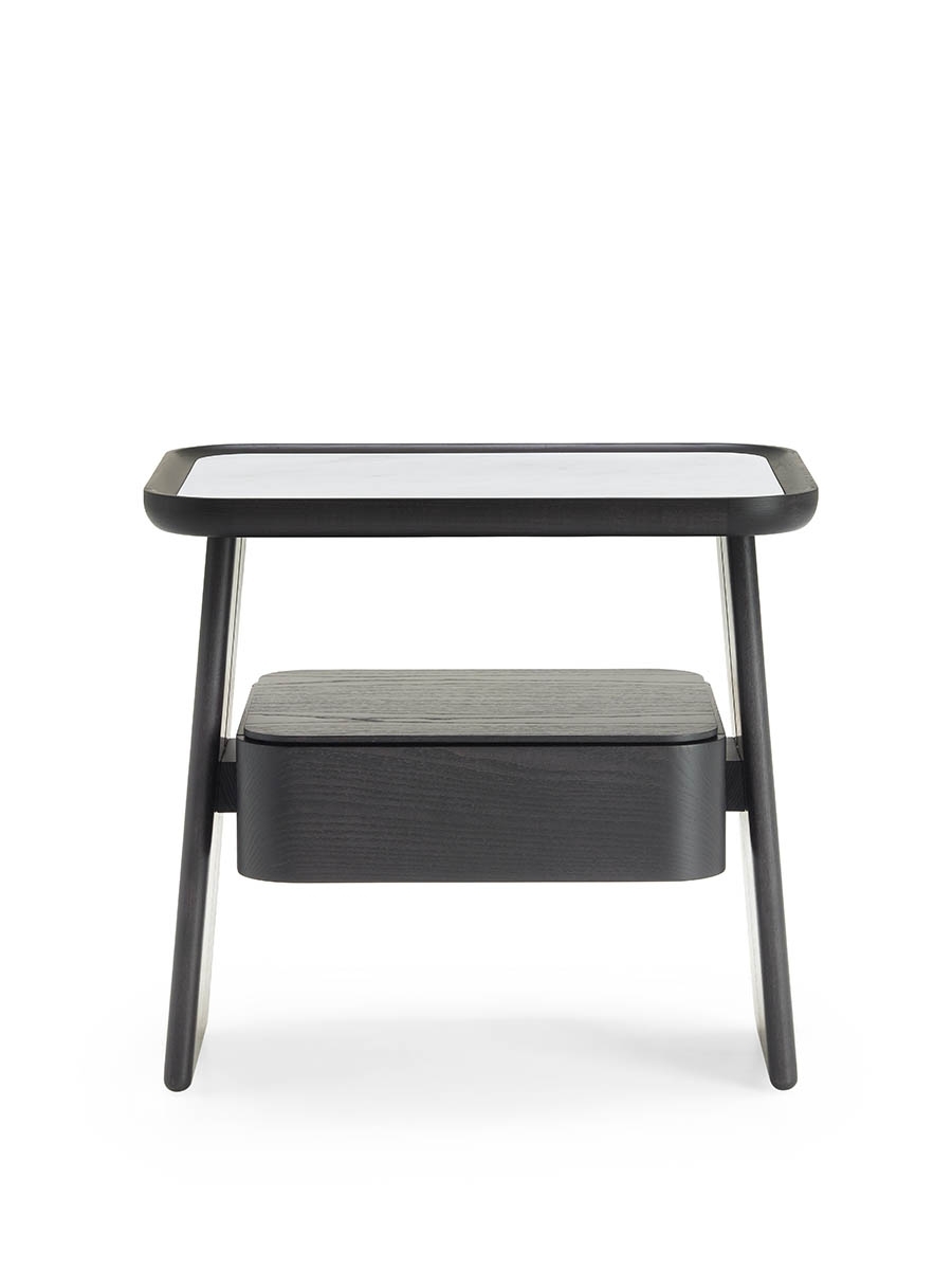 The DUO Night Table is a designer bedside table with a clean, elegant silhouette. Its structure and shelf frame are made of solid ash wood. The base version features two angled uprights, connected by a crossbar, holding a support surface. The DUO night table comes in three configurations: with drawer, shelf or crossbar. The version with drawer, sculpted from solid wood with shaped corners, features an integrated handle on the bottom edge of the front panel for easy opening and closure. The DUO night table top is available in a range of finishes.