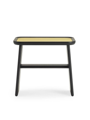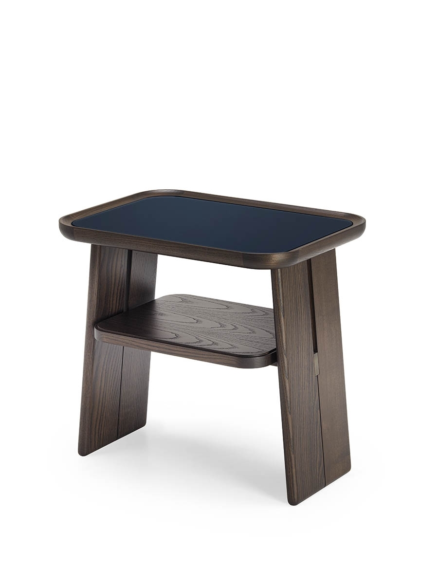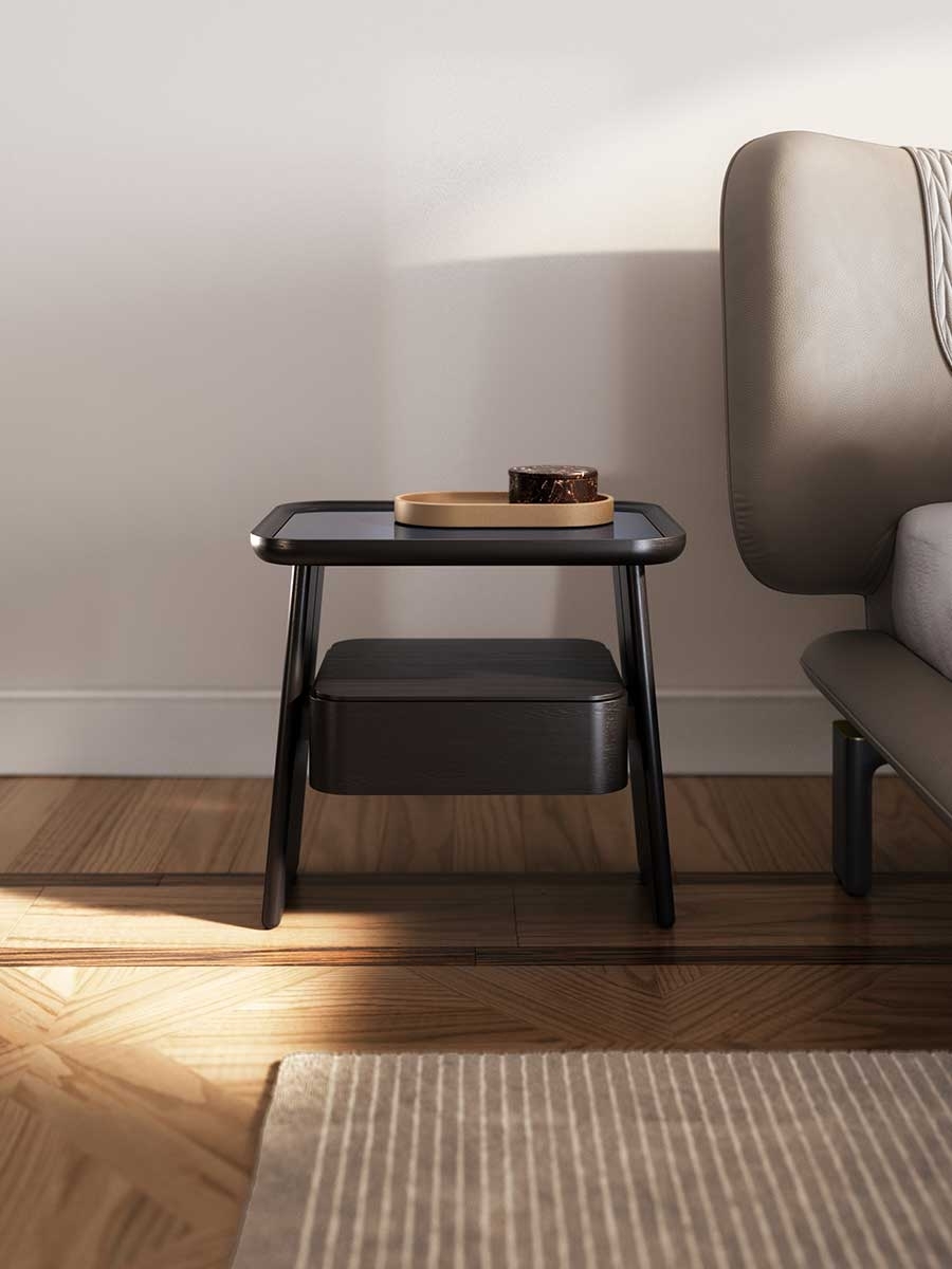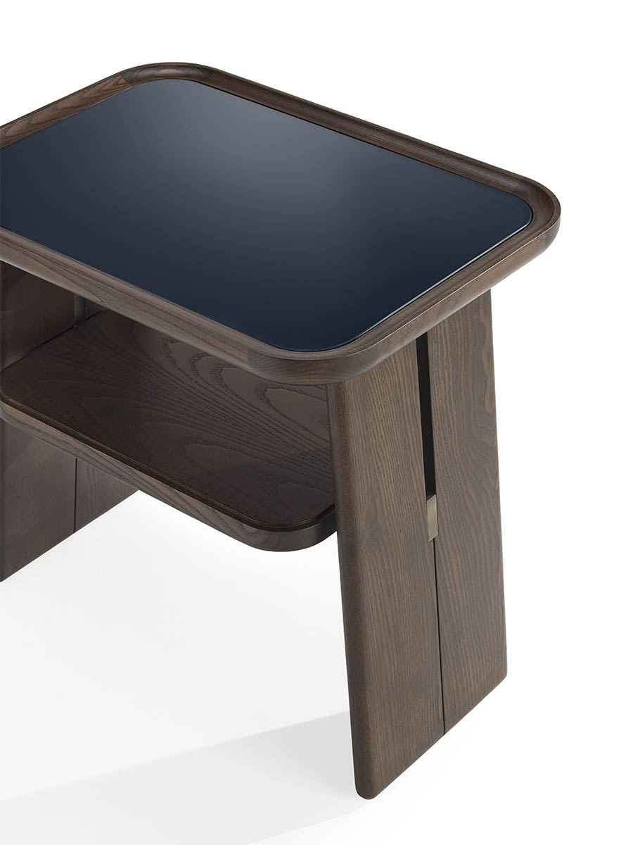 The DUO Night Table is a designer bedside table with a clean, elegant silhouette. Its structure and shelf frame are made of solid ash wood. The base version features two angled uprights, connected by a crossbar, holding a support surface. The DUO night table comes in three configurations: with drawer, shelf or crossbar. The version with drawer, sculpted from solid wood with shaped corners, features an integrated handle on the bottom edge of the front panel for easy opening and closure. The DUO night table top is available in a range of finishes.