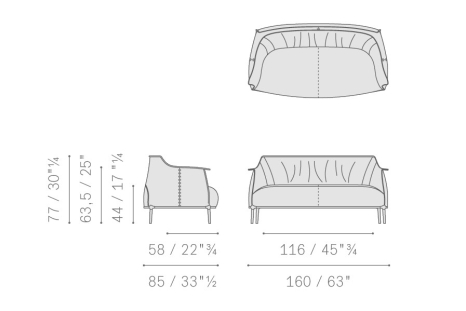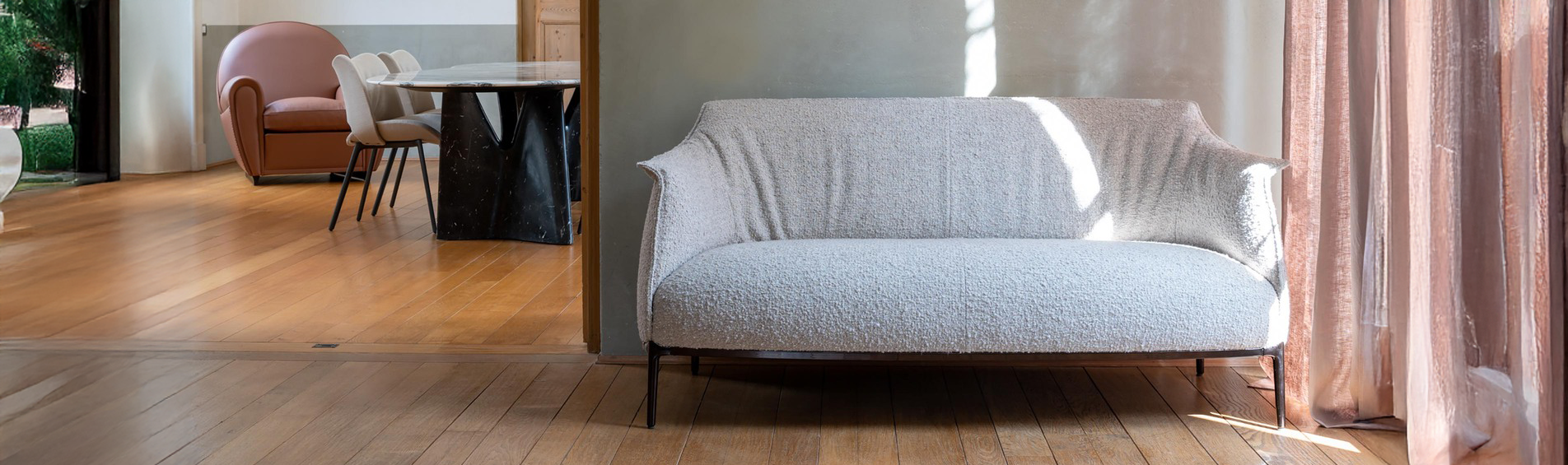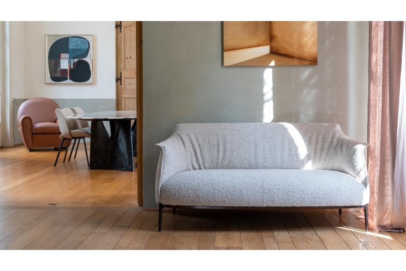 The Archibald seatings by Jean-Marie Massaud are the perfect combination of substance and form. The Archibald collection boasts a comfortable and enveloping design ideal for meditation and relaxation. The breadth and depth of the seat is balanced by the thin feet, which give an agile and slender overall effect. In the Archibald armchair upholstery, pleasantly wavy with its series of vertical folds, is embellished along the edges and external surfaces by contrast stitching, giving it an extra touch of refined elegance.