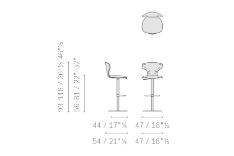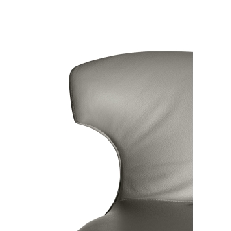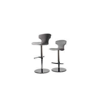 The Montera stool with footrest stands out for the neat proportions and meandering profile of the seat. It features upholstery in Pelle Frau® leather with tone-on-tone stitching or a saddle/leather combination with a clean-cut edge. The Montera swivel stool has a chrome-plated steel column base that allows 360-degree rotation. It is adjustable in height by a gas spring controlled by a lever under the seat. The column features upholstery to match the one of the shell. The footrest features a diamond-patterned knurl. The shell of the Montera stool is made of mold-curved beech plywood and the padding is polyurethane foam.