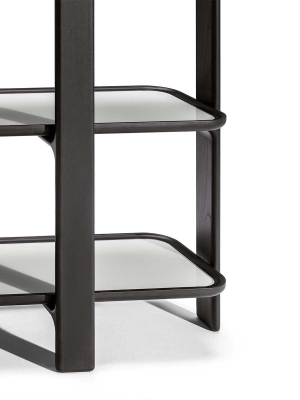 The DUO bookcase consists of staggered uprights and shelves with an ash wood frame available in different finishes. The bottom of the shelves is made of poplar plywood veneered with ash in the same finish chosen for the frame. Upon request, a marble or back-painted glass top can be inserted inside the shelf frames for an even more elegant effect. The DUO bookcase is available with four shelves or two shelves. Metal details with a shaded bronze finish add an extra touch of class and sophistication to the overall design.