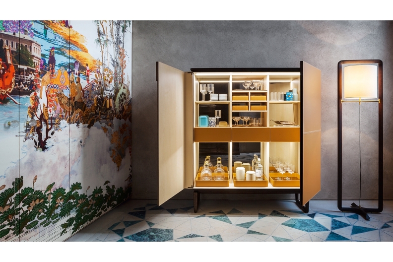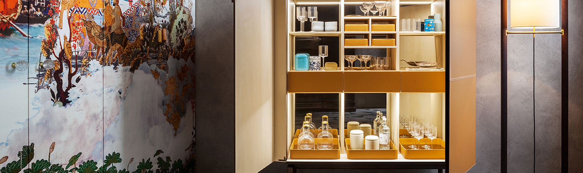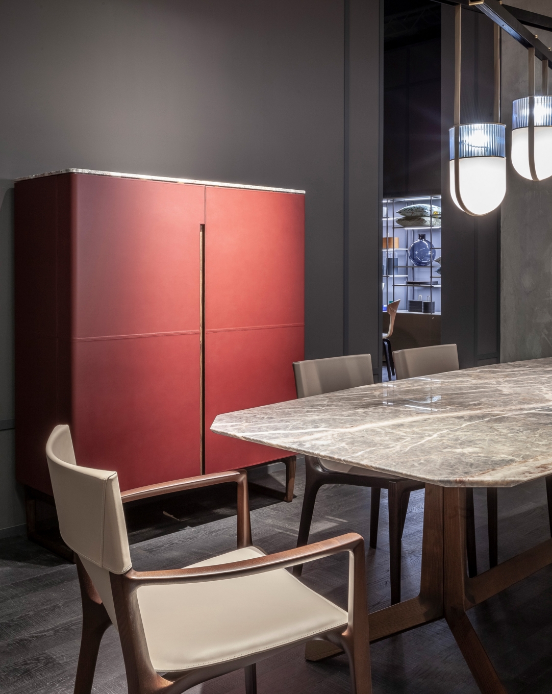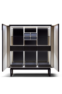 When designing the Fidelio series (Low Cabinet, High Cabinet and Mobile Bar), Roberto Lazzeroni opted for a deliberately clean design combined with precious materials: formal simplicity and sophisticated finishes for a versatile collection that is easy to combine with all other Poltrona Frau furnishings. The functional details become highly distinctive aesthetic elements, like the recessed handles on the surfaces. There is also the intense contrast between the warm, dark tones of the saddle-leather and wood that covers the exteriors, and the luminous explosion of the light natural maple that reveals itself in the compartments.