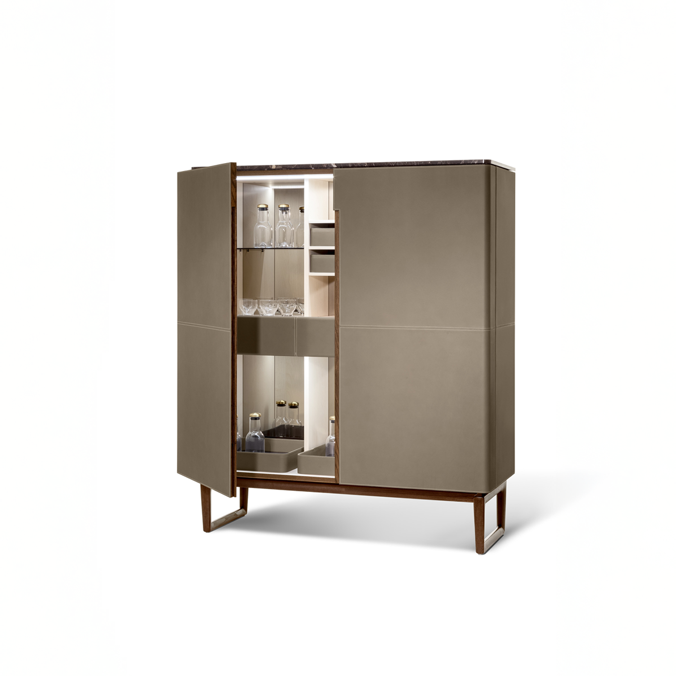 The collection includes the Low Cabinet, the High Cabinet and the Fidelio Mobile Bar. The supporting structure is in solid ash and birch plywood with moka-coloured ash veneer on the outside. The extra light natural maple wood brightens the interior. The doors are in birch plywood and poplar with the insides veneered in moka-stained ash for the Fidelio Low Cabinet and extra light natural cut maple wood in the Fidelio High Cabinet. The edging of the doors is produced from solid ash in a moka stain. The top is available in moka-stained ash, in glossy or semi-glossy Calacatta gold marble and in glossy Emperador marble. The sawhorse base, in moka-stained solid ash with triangular cross-section, adds to the light feel of the design. The base is fixed to the structure with cylindrical spacers in matt black painted steel. The adjustable steel feet have rubber caps. Fine saddle-leather is used to upholster the sides, doors, inside drawers and, on request, the back of the cabinet. Choice between tone-on-tone or contrast stitching. The inside of the Fidelio Mobile Bar is designed to lighten up when the doors are opened. The back wall of the cabinet is covered with two bronzed mirrors.