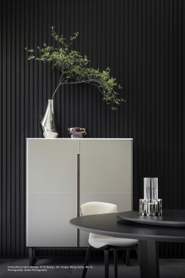When designing the Fidelio series (Low Cabinet, High Cabinet and Mobile Bar), Roberto Lazzeroni opted for a deliberately clean design combined with precious materials: formal simplicity and sophisticated finishes for a versatile collection that is easy to combine with all other Poltrona Frau furnishings. The functional details become highly distinctive aesthetic elements, like the recessed handles on the surfaces. There is also the intense contrast between the warm, dark tones of the saddle-leather and wood that covers the exteriors, and the luminous explosion of the light natural maple that reveals itself in the compartments.