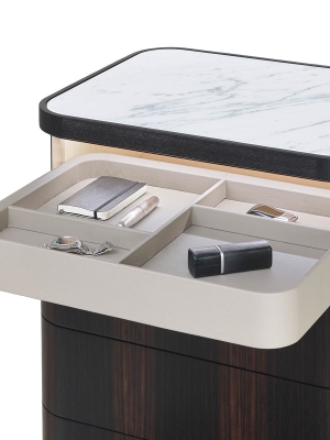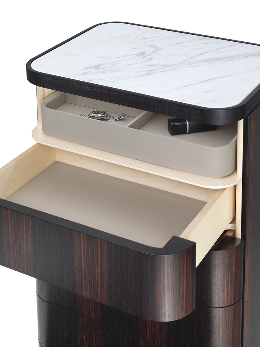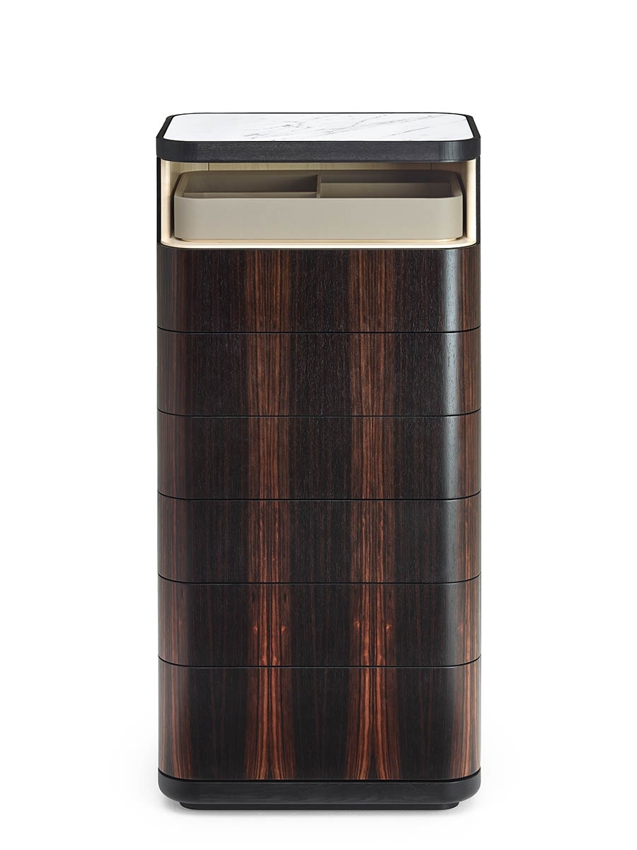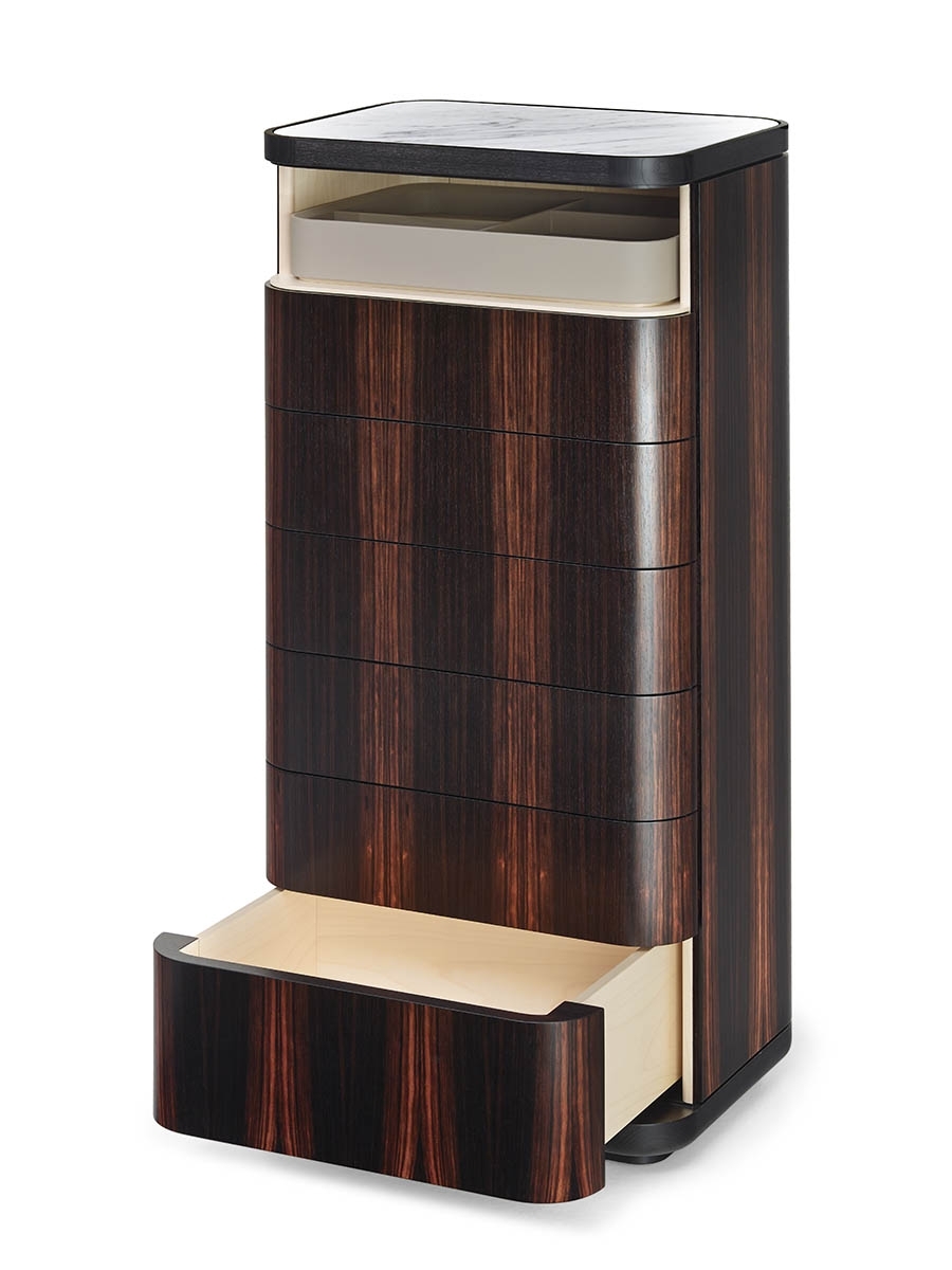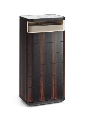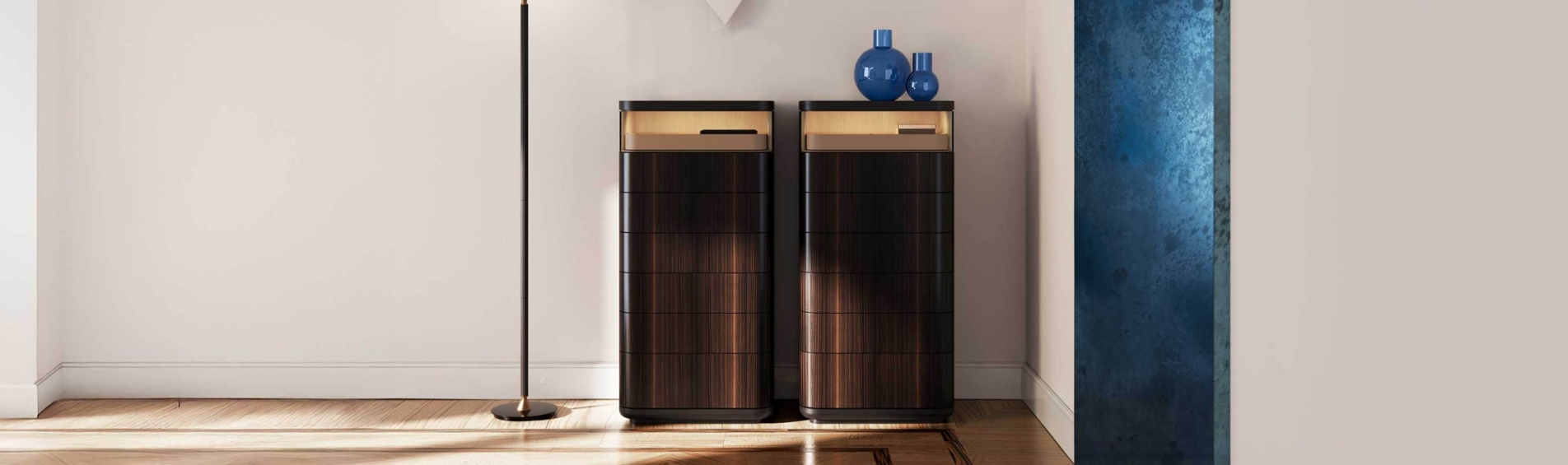 The DUO designer drawer unit is an elegant vertical storage unit, featuring six spacious drawers and a small open compartment, enriched by a touch-controlled LED light that illuminates the interior. A sliding drawer, divided into four compartments, can be inserted into the open compartment. Made of ash wood, the DUO drawer unit is available with various finishes.